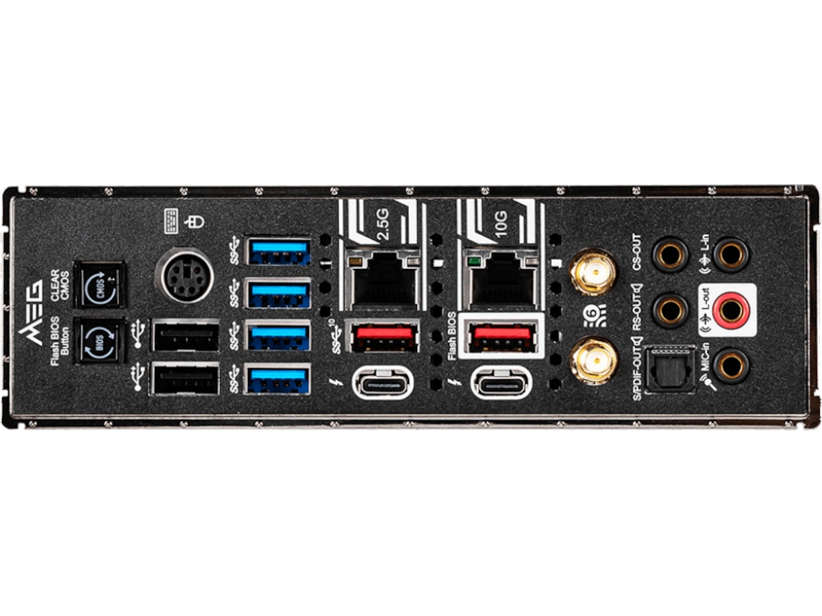1 x lydutlinje - minijakk, 1 x lydutlinje (senter/subbasshøyttaler) - minijakk, 1 x PS/2-tastatur / -mus, 2 x USB 2.0, 1 x lydinnlinje - minijakk, 1 x LAN (2.5Gigabit Ethernet), 1 x lydutlinje (bakre) - minijakk, 1 x mikrofon - minijakk, 4 x USB 3.2 Gen 1, 1 x TOSLINK, 2 x Thunderbolt 3/USB-C Gen2, 1 x LAN (10Gigabit Ethernet), 2 x USB 3.2 Gen 2