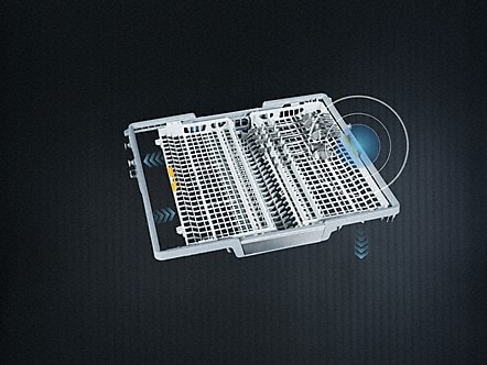 Vi har forbedret bestikkskuffen: Nå kan du også plassere små gjenstander, slik som espressokopper, i bestikkskuffen på oppvaskmaskinen. 3D-MultiFlex-skuffen består av en senket midtre del og to sidedeler. Den venstre delen kan skyves mot høyre for å lage plass til høye vinglass i overkurven. I den nedsenkbare høyre delen kan du enkelt plassere stort bestikk og små servisedeler.