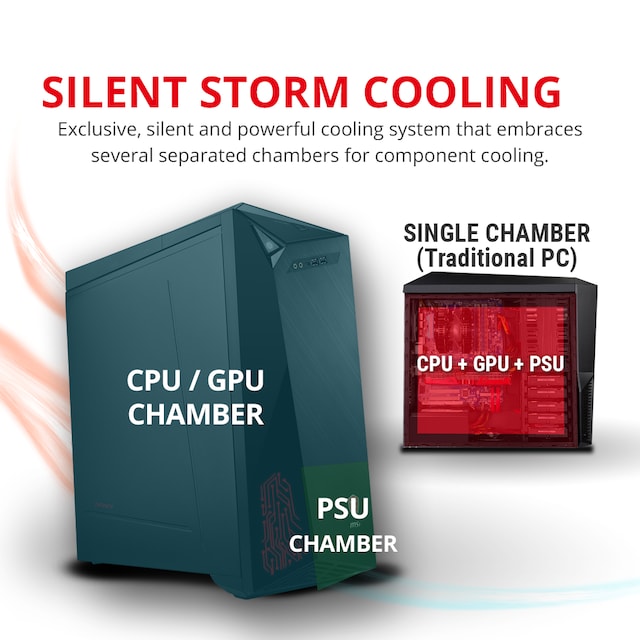 For å få enestående ytelse er MSI Gaming Desktop utstyrt med et eksklusivt, intelligent og kraftig kjølesystem. MSI Silent Storm Cooling omfatter flere atskilte kamre som individuelt tar seg av forskjellige komponenter i systemet. Denne unike designen sørger for at systemets temperatur holder seg perfekt under kontroll, og støtter en kjølig og stillegående drift.