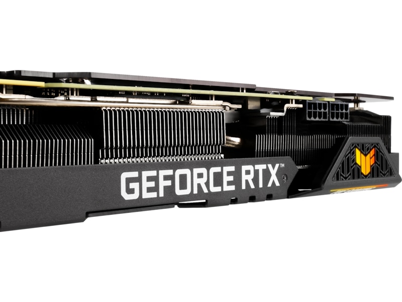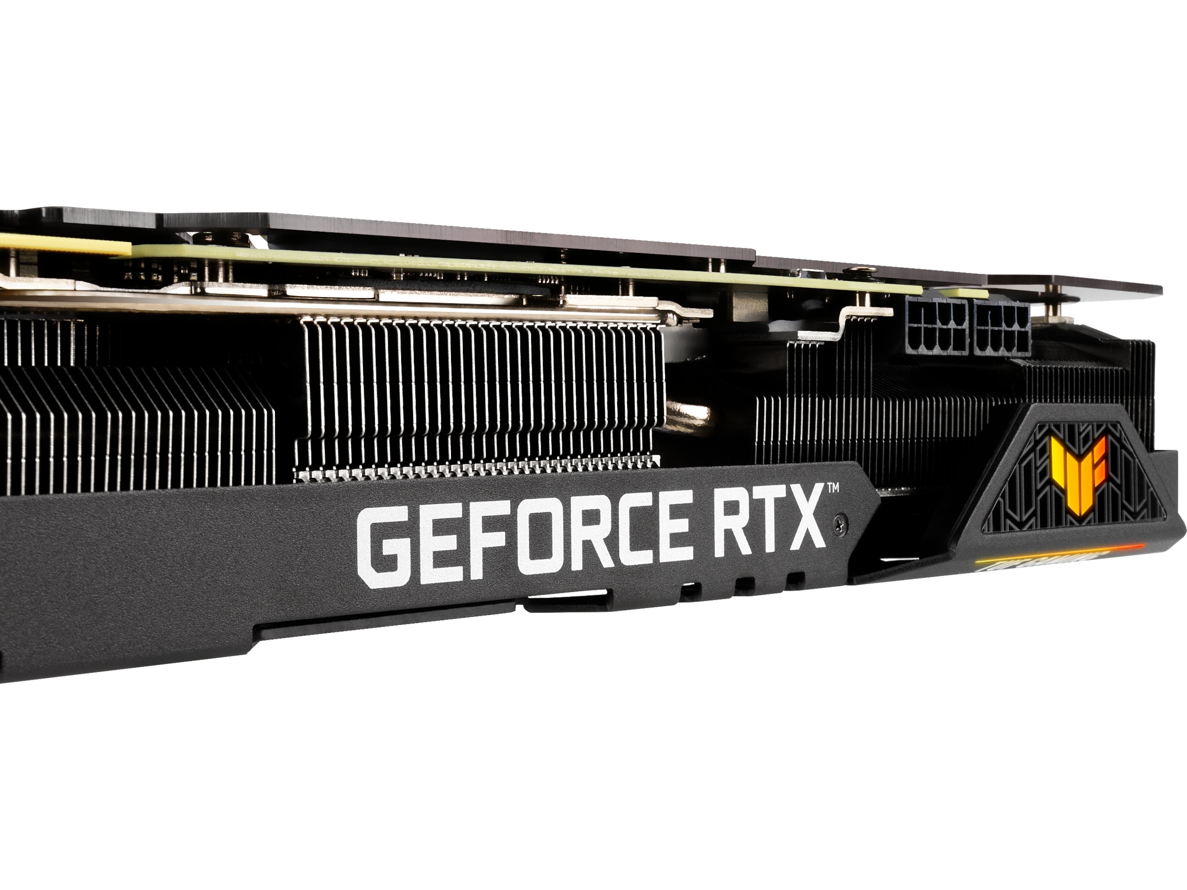 Varmesprederen trekker varmen opp i varmerørene, som fører den gjennom en ribbestabel som fyller det meste av kortets store fotavtrykk på 2,7 spor. Denne generasjonen av TUF Gaming-skjermkort har også en egen kjøleribbe for VRAM for å holde temperaturene godt under de maksimale driftsspesifikasjonene.