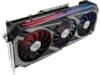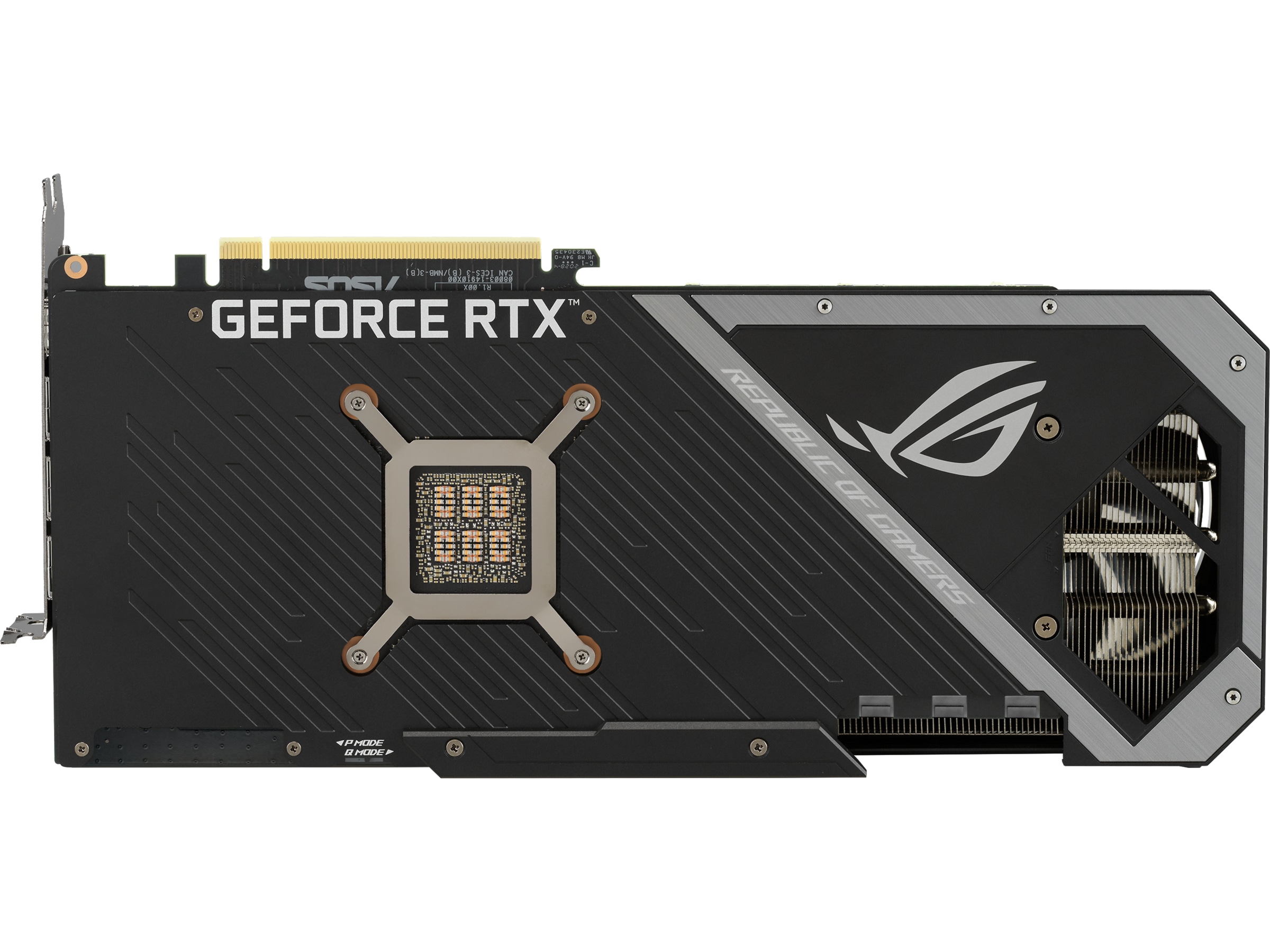 Forsiden på GPU-en er omhyggelig designet, da den er den mest synlige delen av kortet i typiske konfigurasjoner. Et nytt adresserbart RGB-element kan tilpasses med Armory Crate for å skape et ensartet utseende sammen med andre ROG-komponenter. For å oppfylle strømkravene til GeForce RTX 3080 finnes det tre 8-stifts strømkontakter, i tillegg til en innebygd krets som overvåker PSU-skinnespenningen. Kretsen er rask nok til å fange transienter som fører til at skinnespenningen faller for lavt. Hvis det skjer, vil en rød LED-lampe lyse opp for å indikere at det er et problem med strømforsyningen. Den forsterkede metallrammen på Strix er også synlig her, og gir et fysisk lag av holdbarhet.
