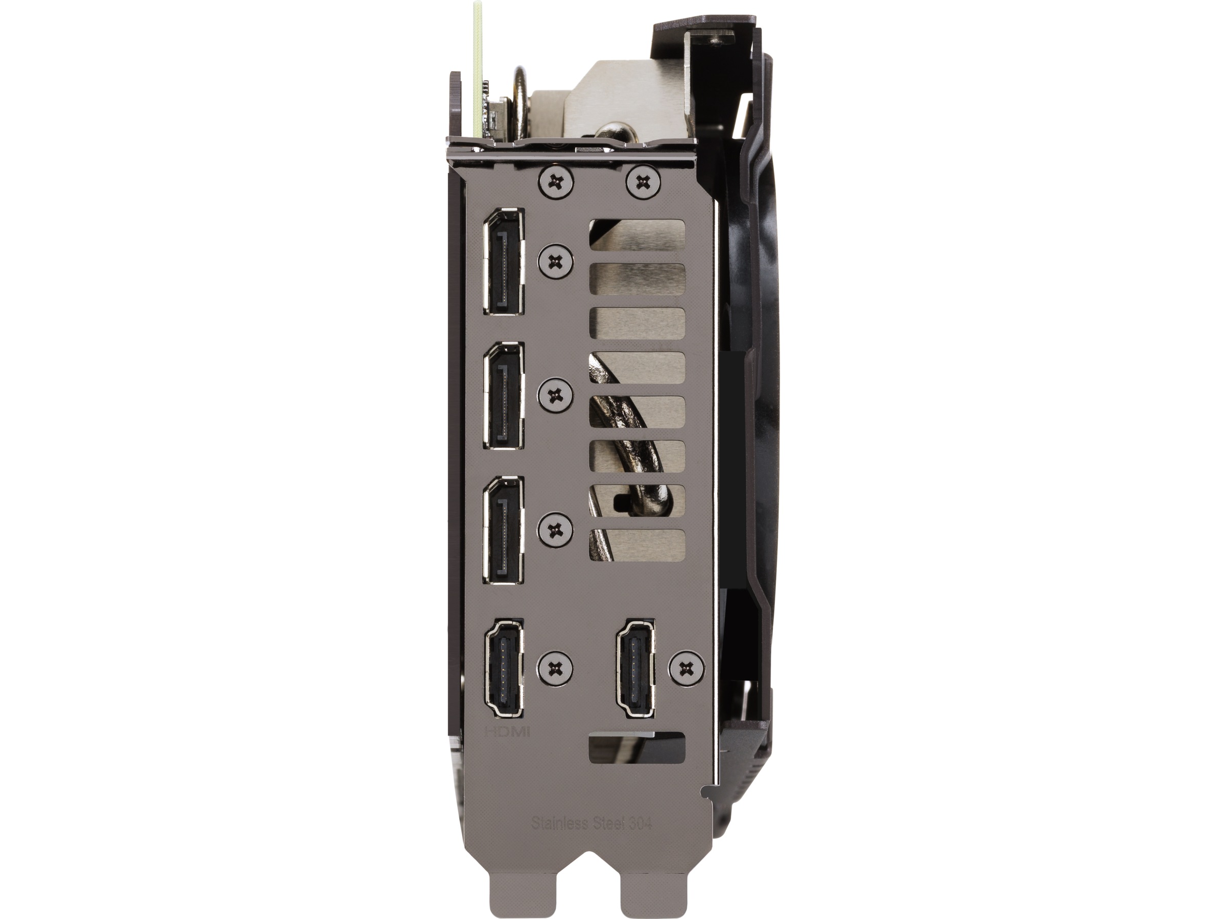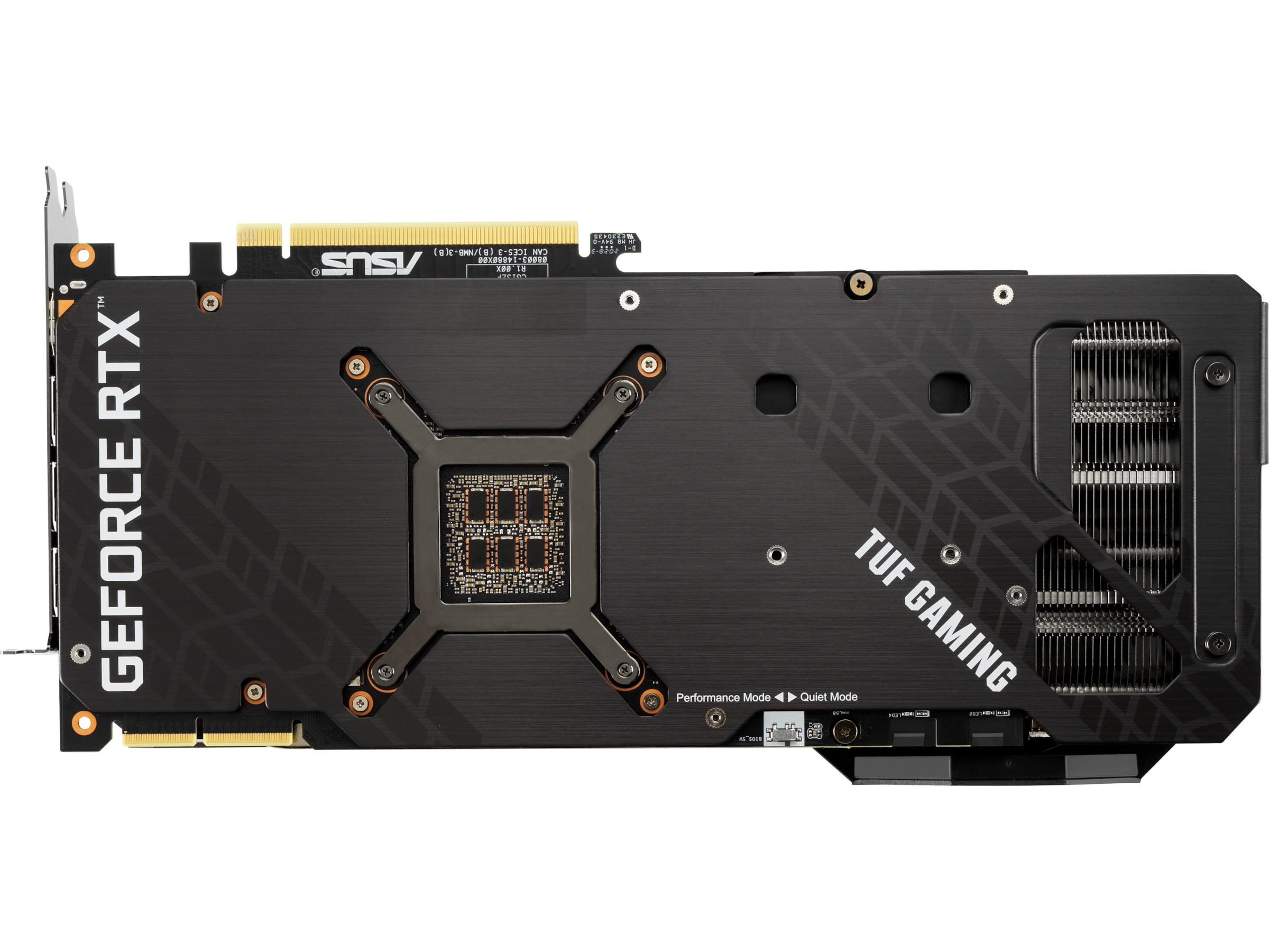 Varmesprederen trekker varmen opp i varmerørene, som fører den gjennom en ribbestabel som fyller det meste av kortets store fotavtrykk på 2,7 spor. Denne generasjonen av TUF Gaming-skjermkort har også en egen kjøleribbe for VRAM for å holde temperaturene godt under de maksimale driftsspesifikasjonene.