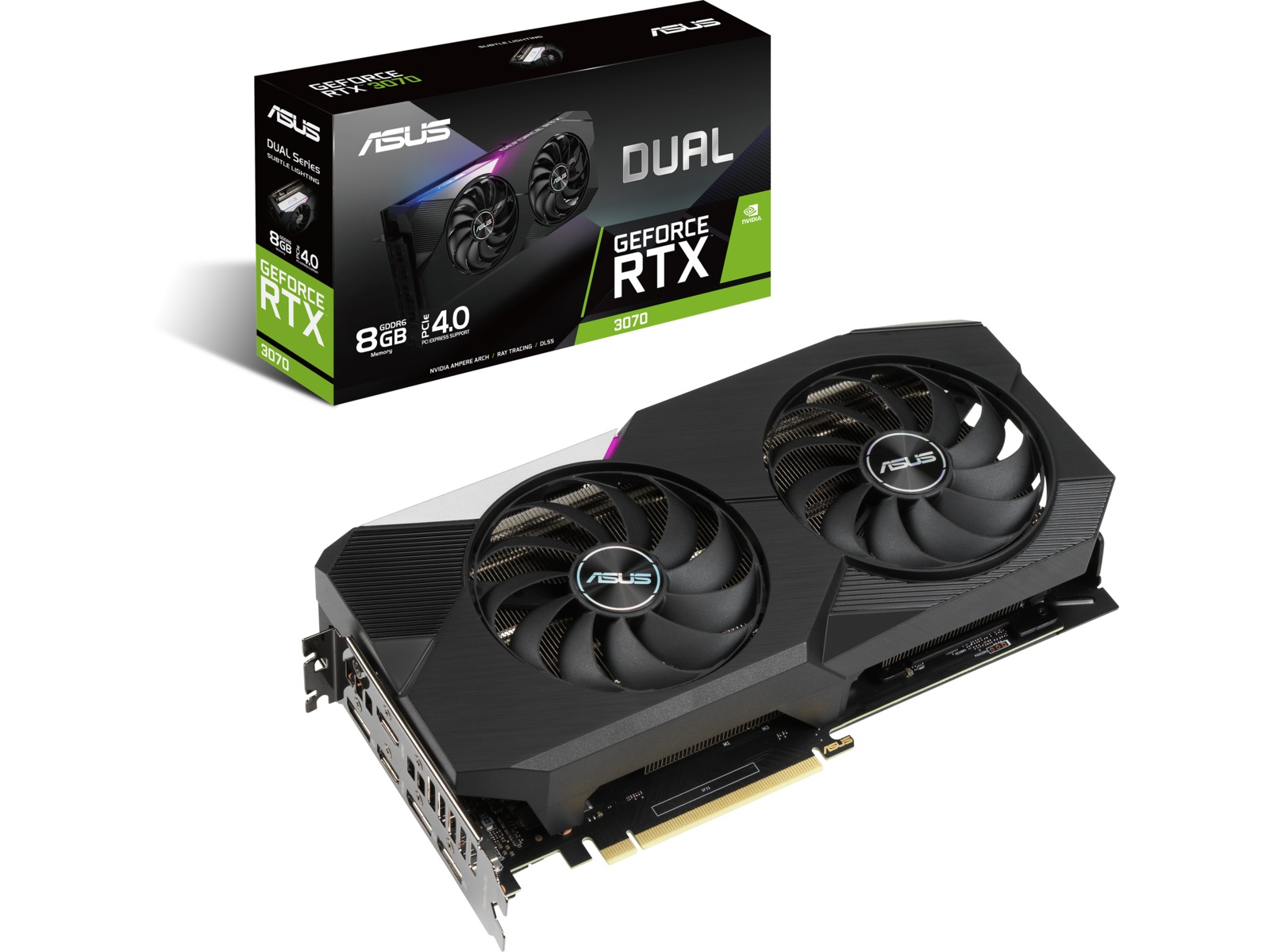 ASUS Dual GeForce RTX 3070 gir deg den nyeste Nvidia Ampere-arkitekturen i sin reneste form og kombinerer ytelse og enkelhet på en enestående måte. Ved å utnytte avansert kjøleteknologi fra flaggskipsskjermkort prioriterer Dual substans fremfor stil, det perfekte valget for et velbalansert bygg. Spenn deg fast for banebrytende gamingkraft.