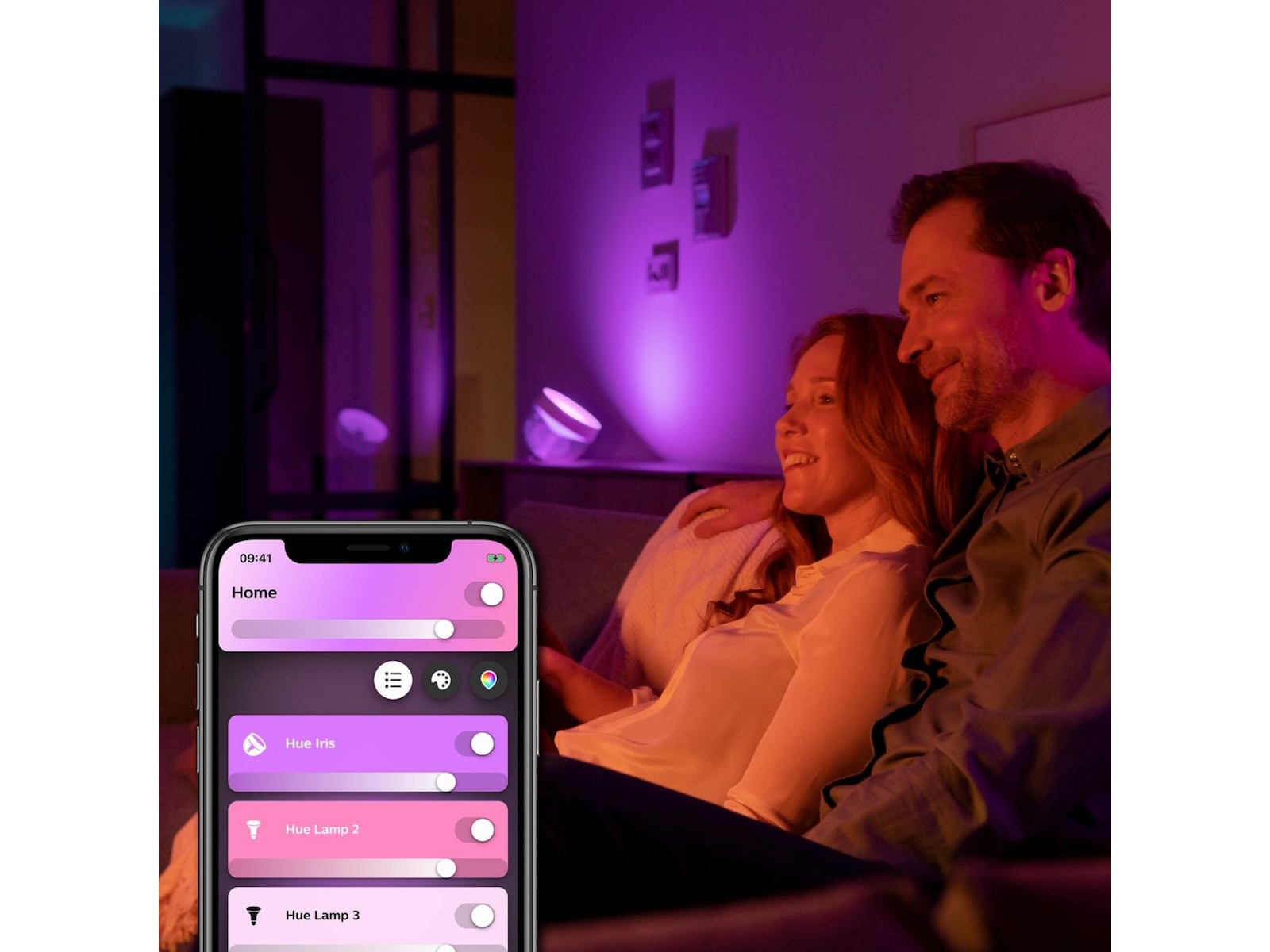 Iris skaper en avansert og unik effekt ved å bade veggen i farger og skape et behagelig bakgrunnslys. Bruk den samme med Hue Bridge for å få et komplett utvalg av smarbelysningsfunksjoner.
