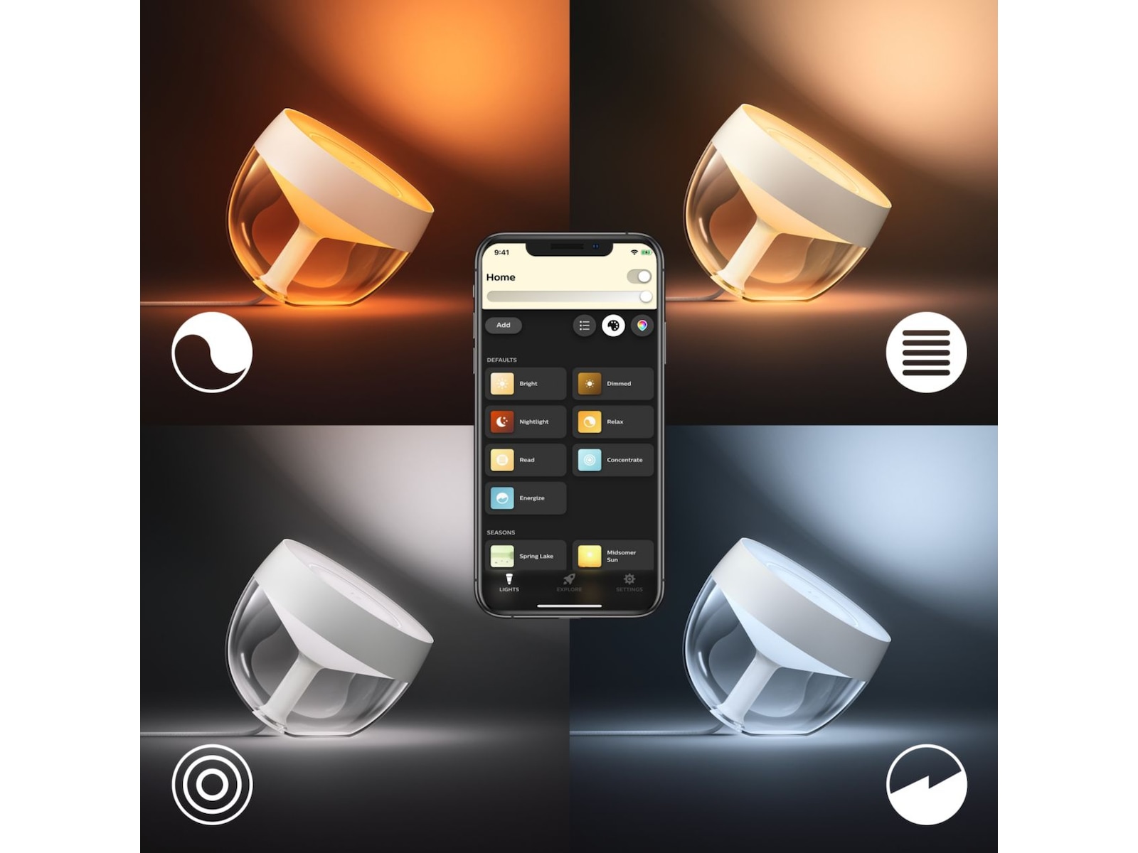 Gjør dagen din lettere og behageligere med fire lysinnstillinger som er håndlaget spesielt for daglige gjøremål: Energize, Concentrate, Read og Relax. De to kalde nyansene, Energize og Concentrate, hjelper deg med å komme i gang om morgenen eller holde fokus, mens de varme instillingene Read og Relax er perfekt når du vil nyte en god bok eller slappe av.