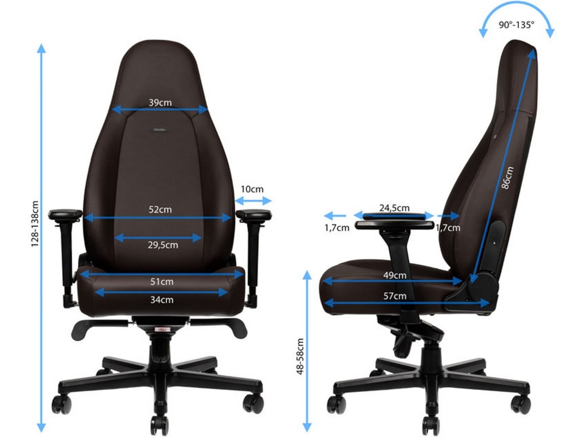 ICON-serien fra noblechairs tilbyr en enestående variasjon av justeringsmuligheter. I tillegg til 10 cm høydejustering inkluderer denne gamingstolen en komfortabel vippemekanisme, justerbar ryggstøtte og praktiske 4D-armlener. 4D-armlenene kan justeres i fire dimensjoner for å få den perfekte sittestillingen for alle brukere. I tillegg til vippemekanismen, som kan vippes opptil 11°, kan ryggstøtten også justeres fra 90° til 135°.