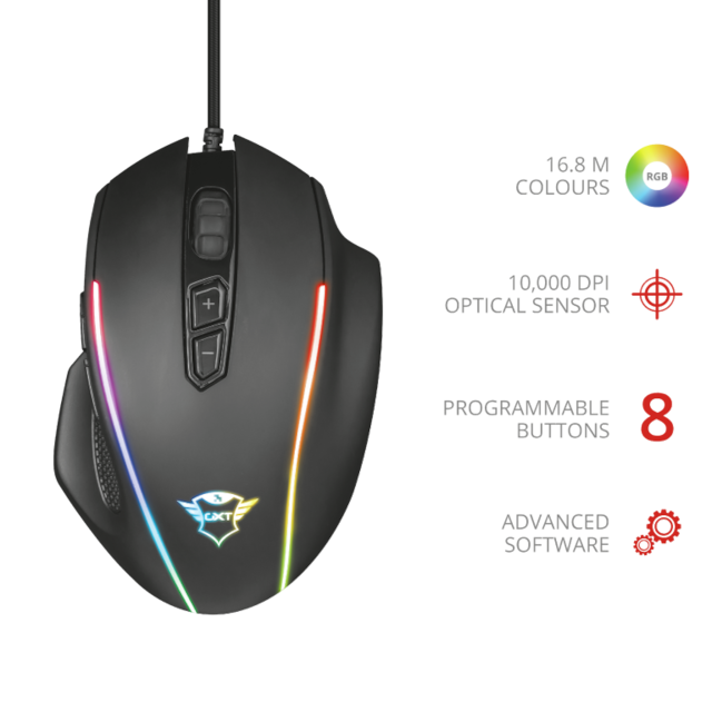 Den høye presisjonen og tilpasningsevnen til gamingmusen GXT 165 Celox holder deg ett skritt foran motstanderne dine. Du har full kontroll over alle handlingene i spillet takket være de programmerbare knappene og makroene. Gjør deg klar til å takle alle utfordringer!