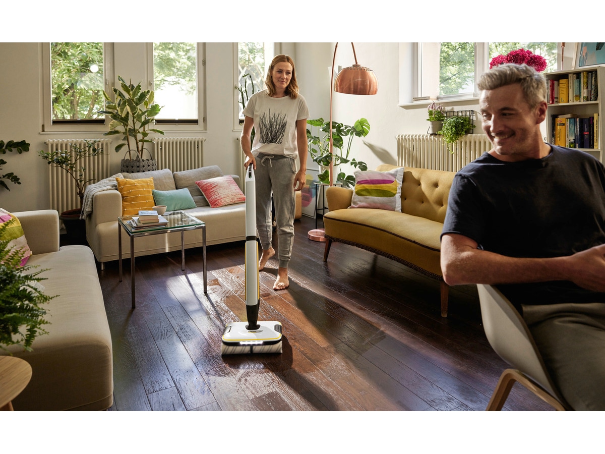 Alt i ett: Den batteridrevne gulvvaskeren FC 7 Premium tar bort både støv og skitt i ett steg. Med LED-lys for for god sikt under møbler.