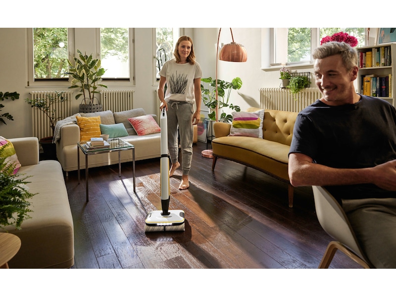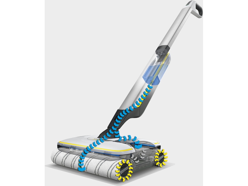 Praktisk under avbrudd: Gulvvaskeren står av seg selv. Praktisk rengjøring under møbler og rundt gjenstander. Fire motroterende ruller sørger for skånsom og uanstrengt vask av gulvet.