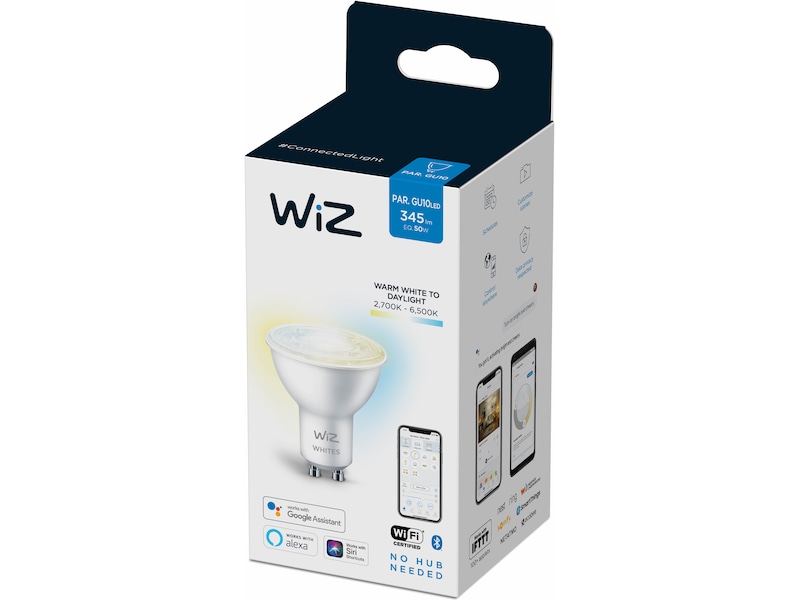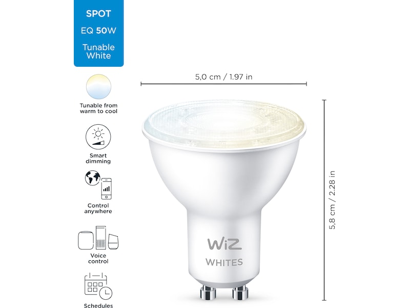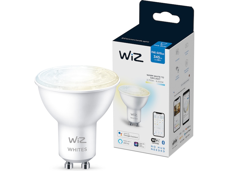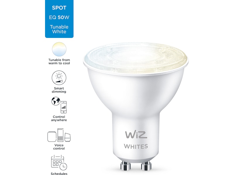 Få alle belysningsnyanser fra varmt til kaldhvitt lys med WiZ tunable white smart-pærer. Med denne GU10-spot, kan dine innebyggede og fritthengende spotter endelig få den riktige lystemperaturen med kraftig høykvalitets LED-belysning.