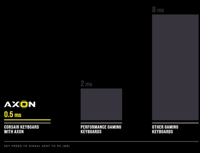 CORSAIR AXON Hyper-Processing-teknologi muliggjør CORSAIRs mest avanserte gamingtastatur ved at den leverer input opptil 4 ganger raskere med innebygd 4000 Hz hyperpolling og 4000 Hz tasteskanning, samtidig som den kjører 20-lags lyseffekter.