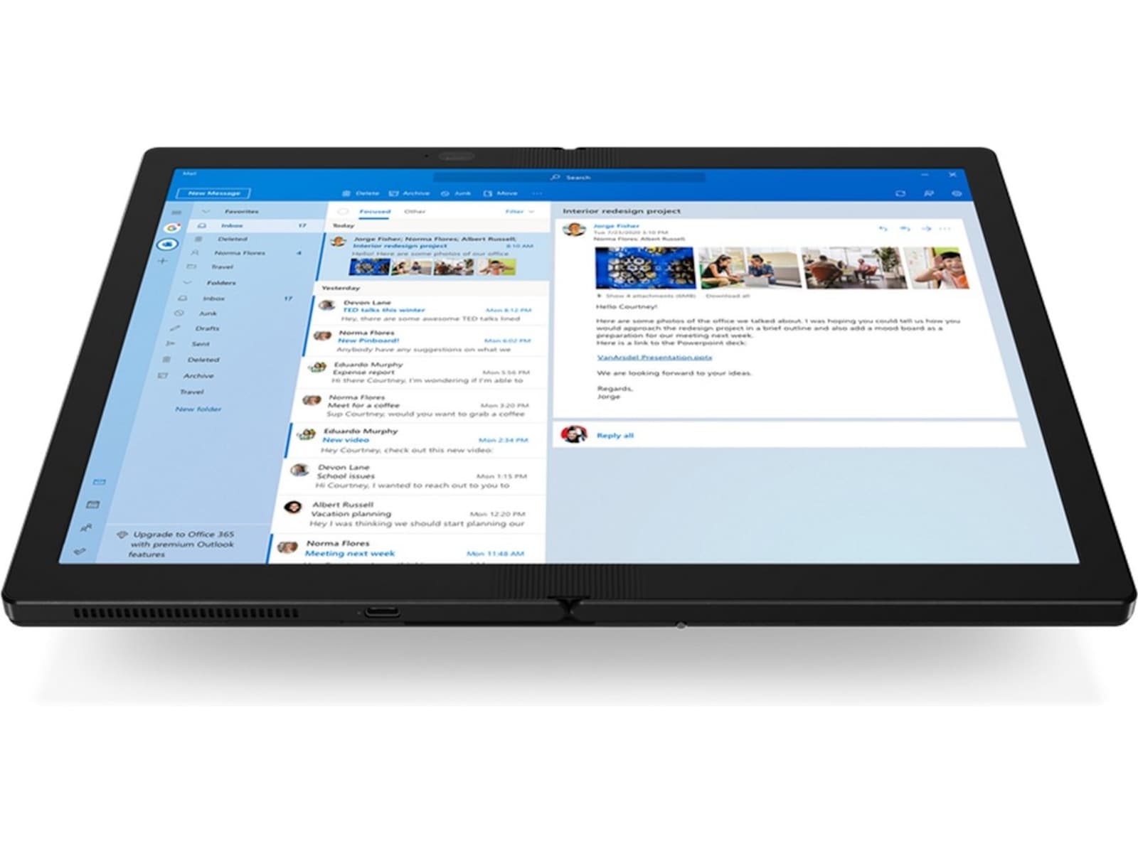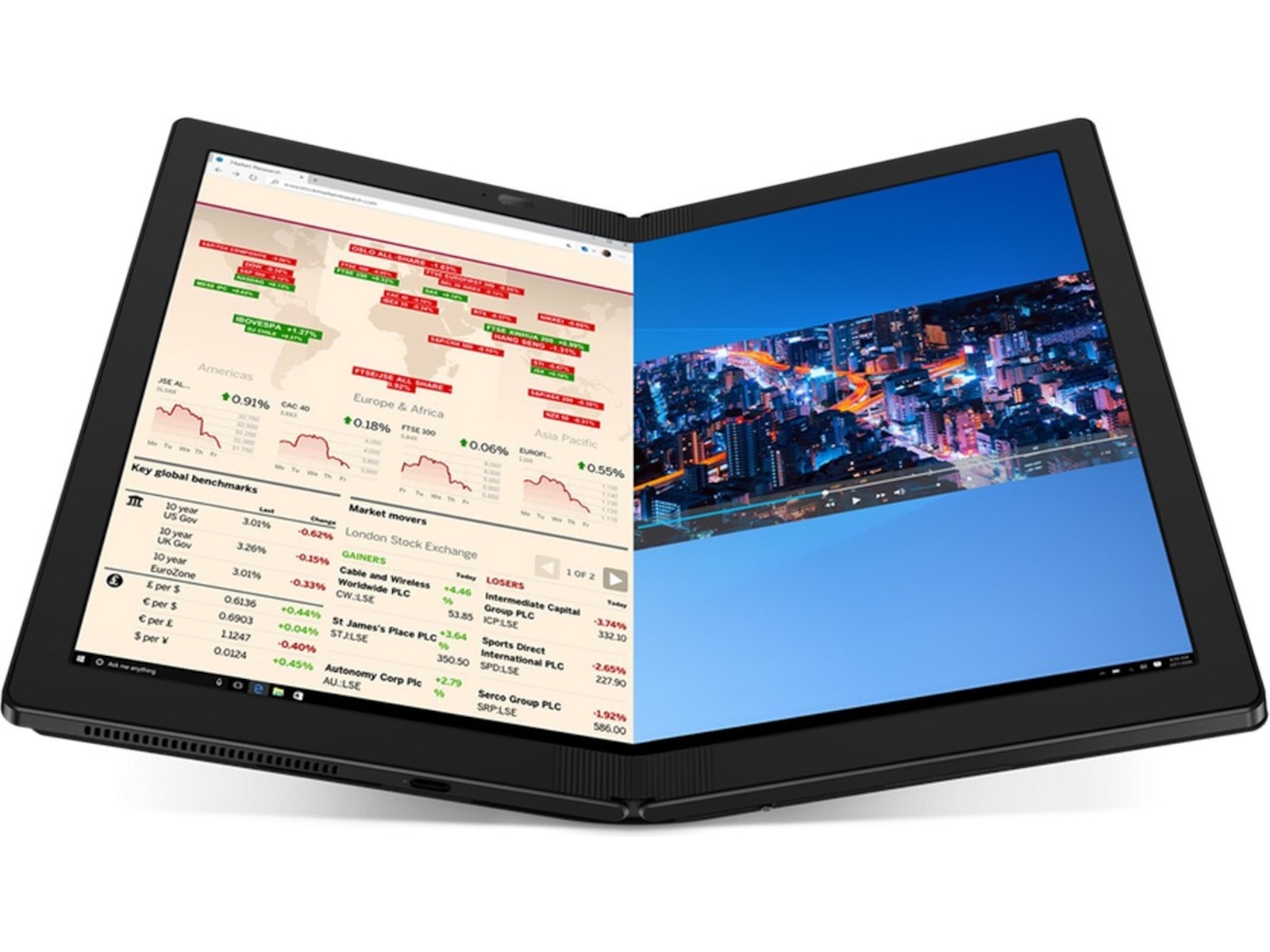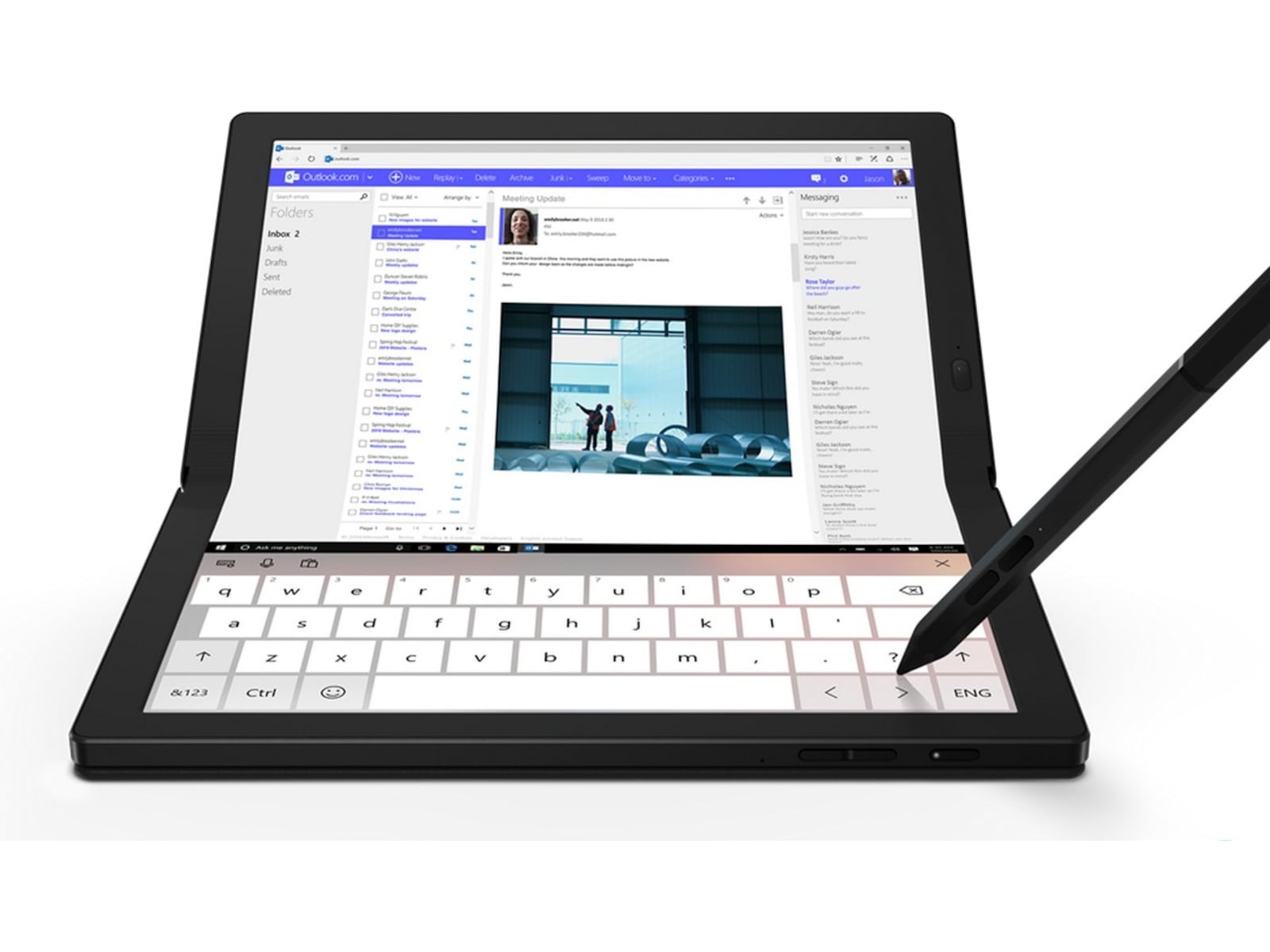 ThinkPad X1 Fold har selvfølgelig en delt skjerm, akkurat som navnet antyder. Du kan folde den som en bok og se to skjermer ved siden av hverandre – perfekt når du vil sammenligne noe, ta notater, lese eller bare gjøre flere ting samtidig. Snu den slik at skjermen deles horisontalt, og du kan tegne, ta notater eller bruke tastaturet på skjermen til å skrive.