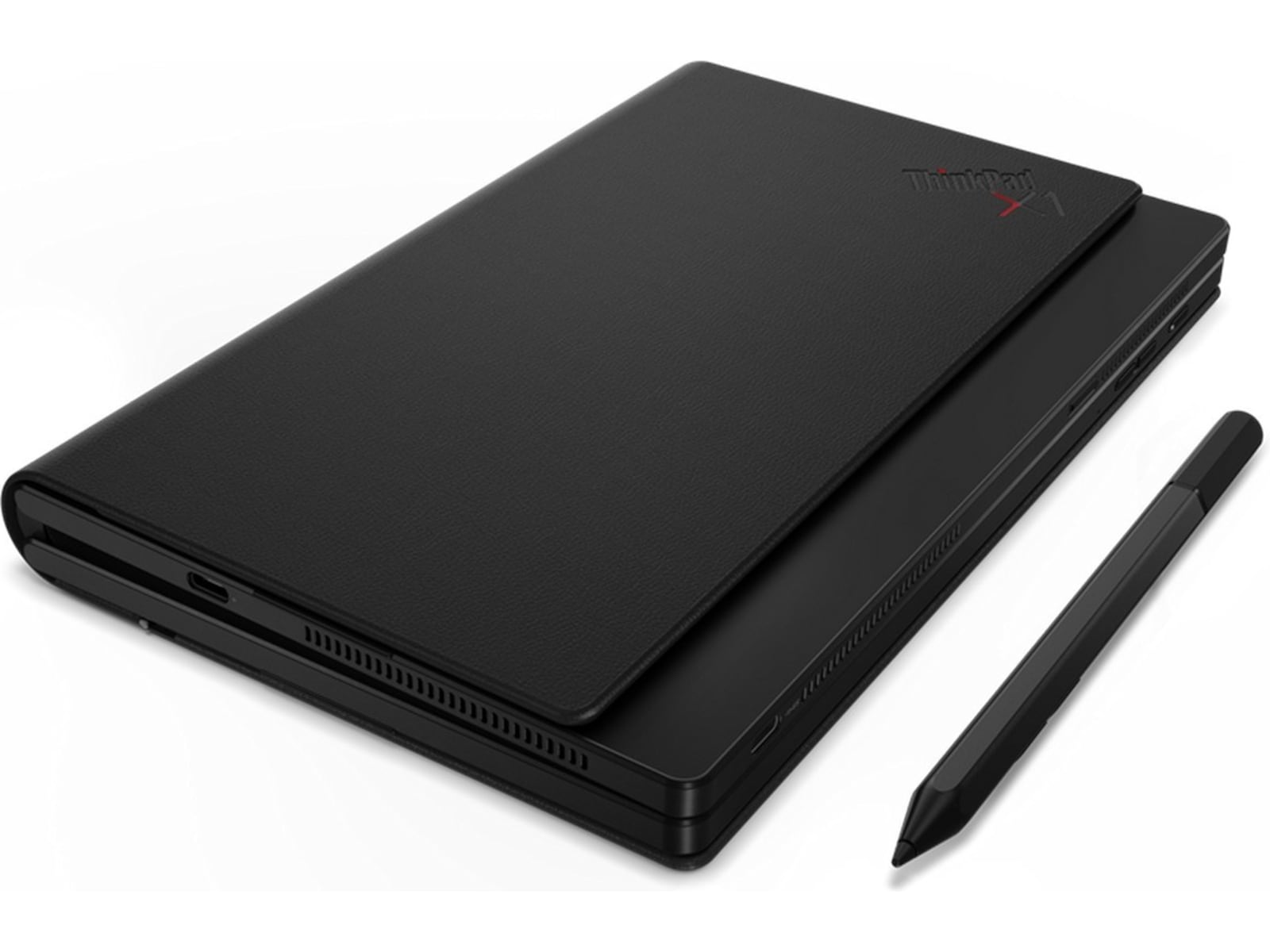 ThinkPad X1 Fold har et lekkert skinnomslag, og ser mer ut som en skissebok enn en bærbar PC. Den er kompakt og stilig, og også funksjonell. Omslaget har et innebygd stativ som kan holde enheten oppreist. Det veier bare 999 g, og passer rett jakkelommen – eller til og med i en liten veske. Det er også robust nok til å tåle røff behandling.