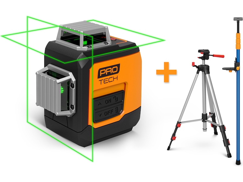 Protech 360° Cross Leveller projiserer linjene med en høy nøyaktighet på opptil ±0,5 mm/m, og sørger for at begge linjene er nøyaktig jevne og akkurat der du vil ha dem. Den tilbyr et arbeidsområde på 20 meter, og den grønne laseren gir deg høy synlighet under alle slags forhold.
