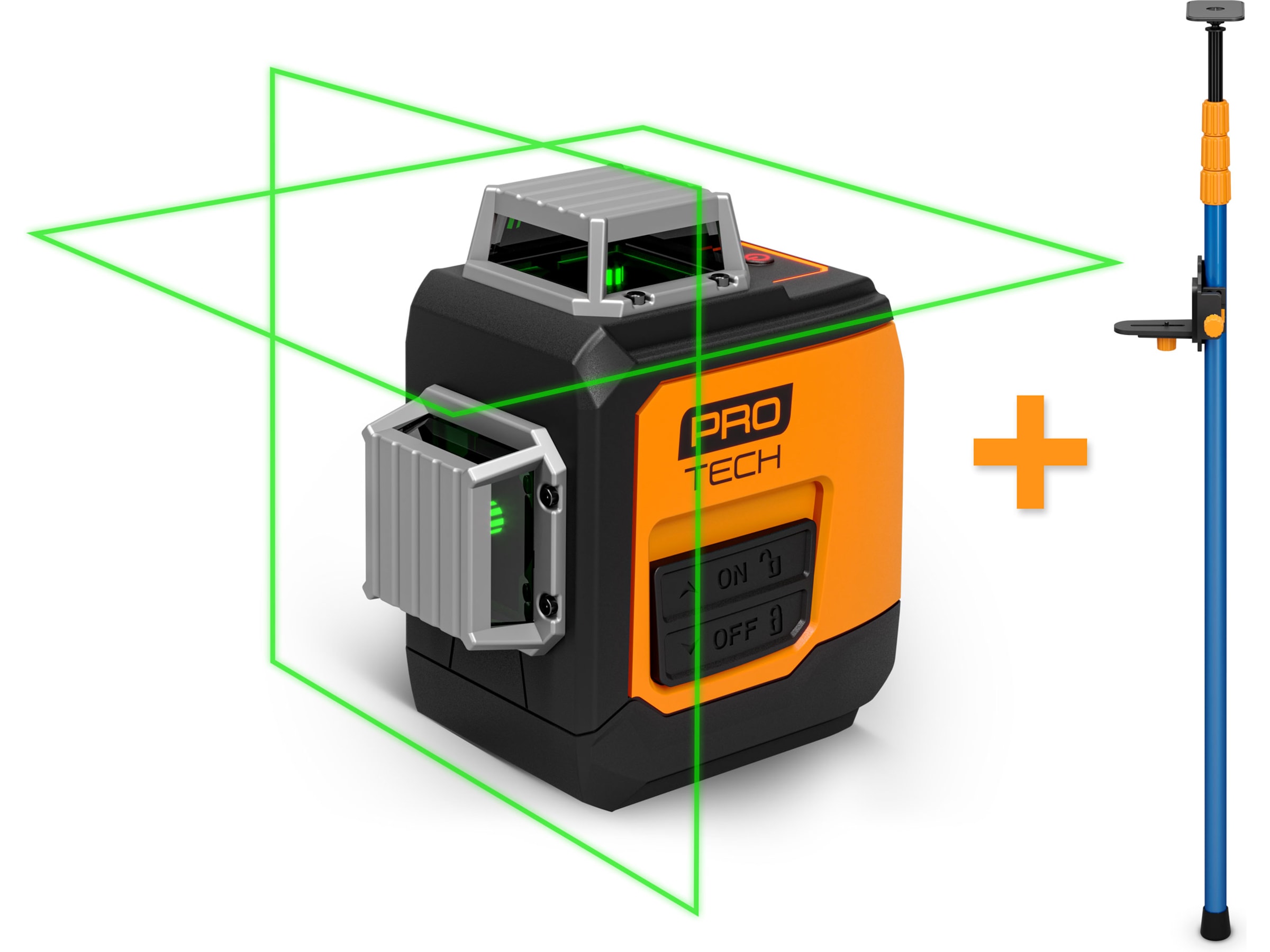 Protech 360° Cross Leveller projiserer linjene med en høy nøyaktighet på opptil ±0,5 mm/m, og sørger for at begge linjene er nøyaktig jevne og akkurat der du vil ha dem. Den tilbyr et arbeidsområde på 20 meter, og den grønne laseren gir deg høy synlighet under alle slags forhold.