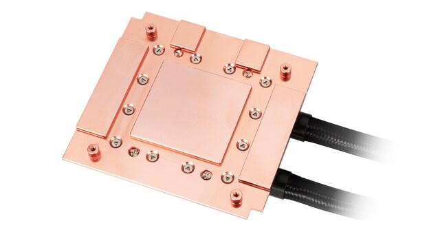 - Kjøleplate med full dekning bringer vannkjøling til GPU-en og minnebrikkene.