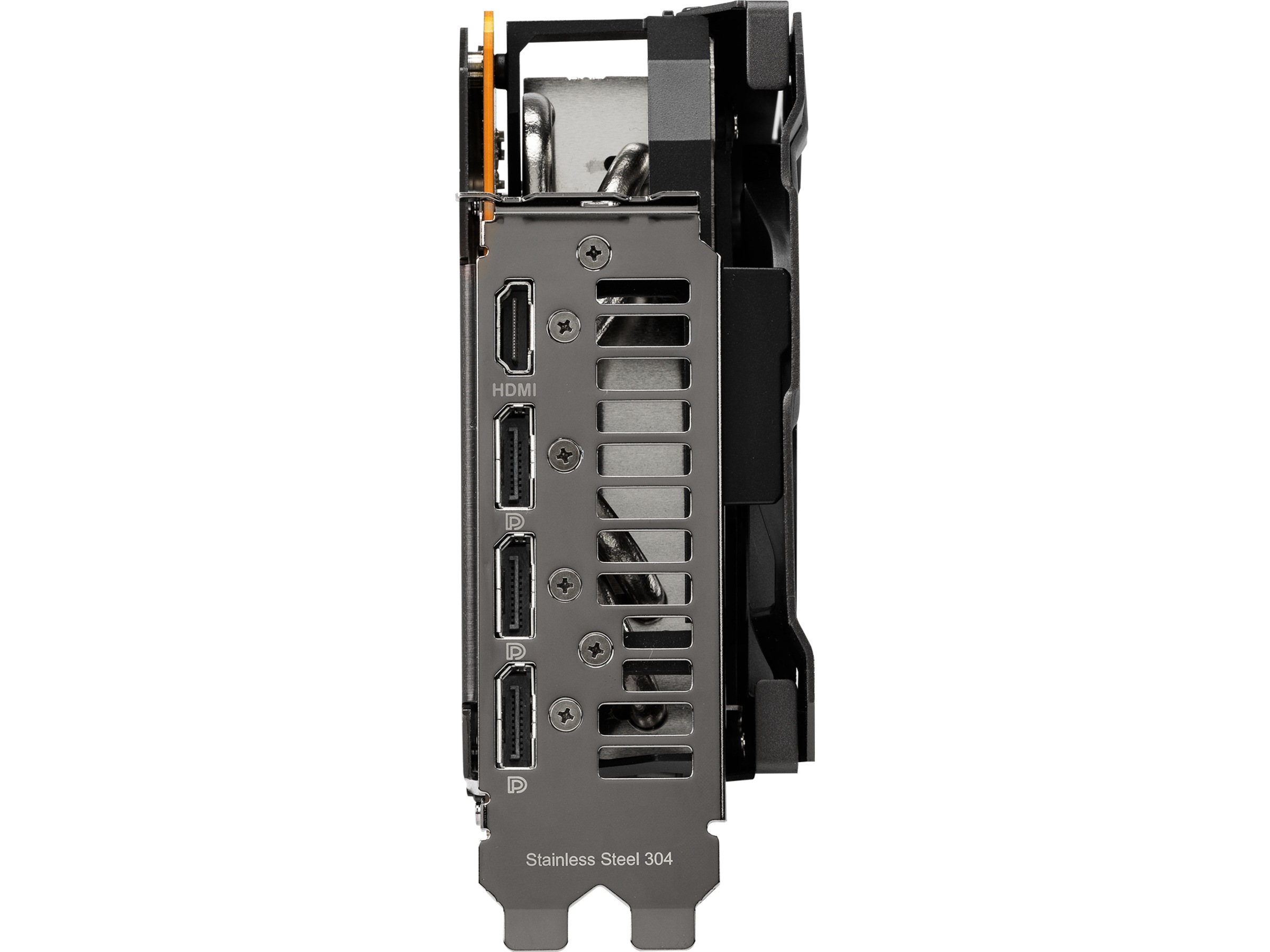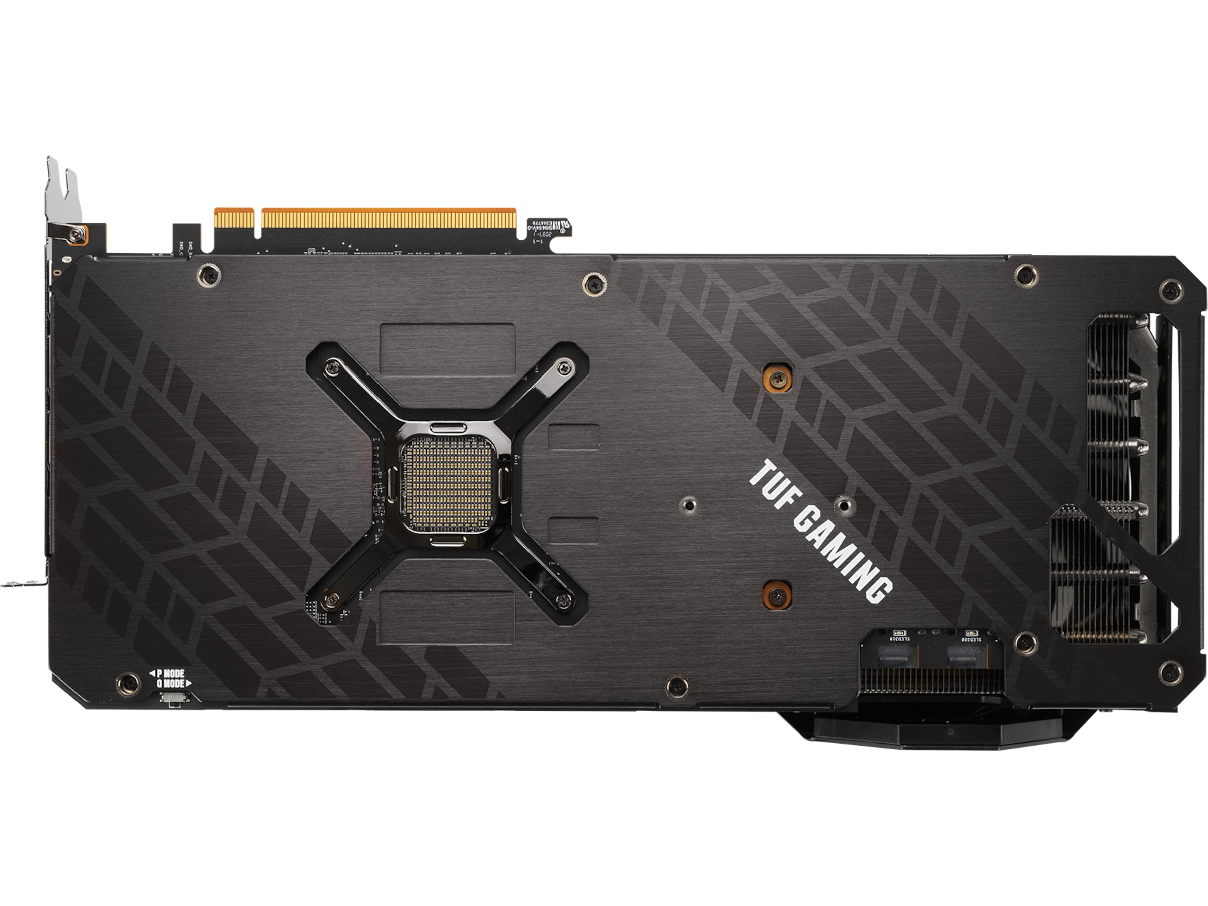 Undersiden av kortet har også fått en rekke forbedringer. Det meste av undersiden er dekket av en beskyttende metallplate som er utstyrt med en stor lufteventil. Lufteventilen sikrer at varm luft blir sendt mot utblåsingsviftene i kabinettet, i stedet for å bli resirkulert tilbake til GPU-ens kjøler. En GPU-brakett tilfører ekstra stabilitet til den kritiske forbindelsen mellom prosessor og varmespreder. I/O-braketten er laget av rustfritt stål for å beskytte porter og for å gi et sikkert feste. En praktisk plassert Dual BIOS-bryter lar deg gjøre tilpasninger av kortets ytelsesprofil uten behov for programvare.