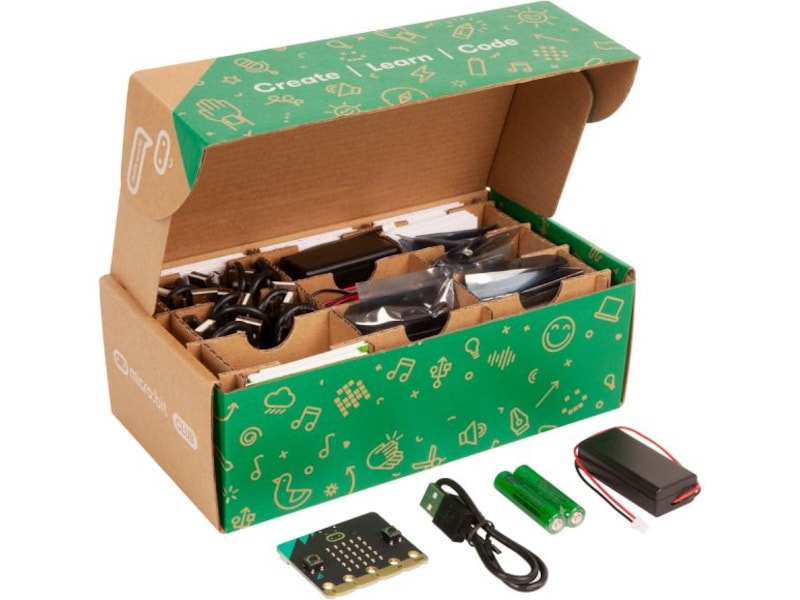 micro:bit Club inneholder 10x BBC micro:bit V2-kort og alt det viktigste som trengs for å få strøm til kortene og begynne å programmere.