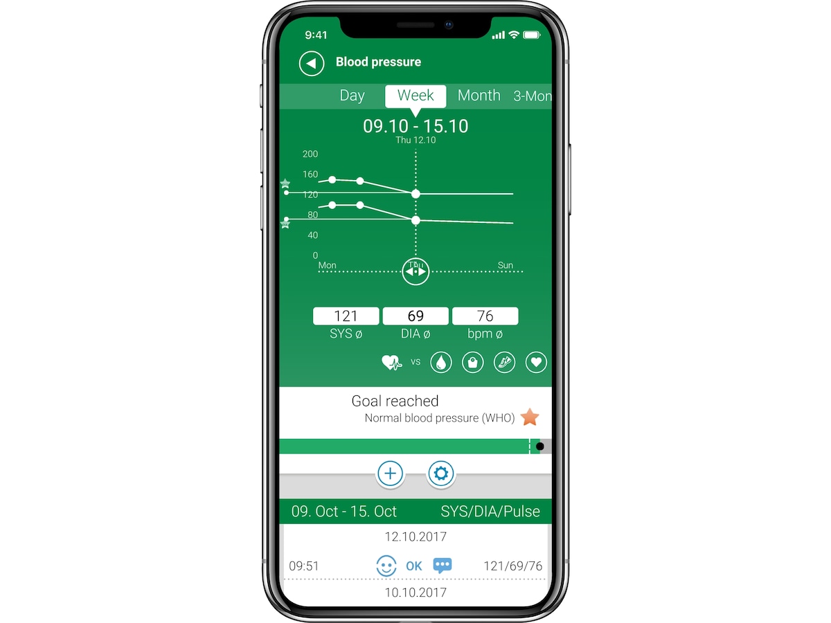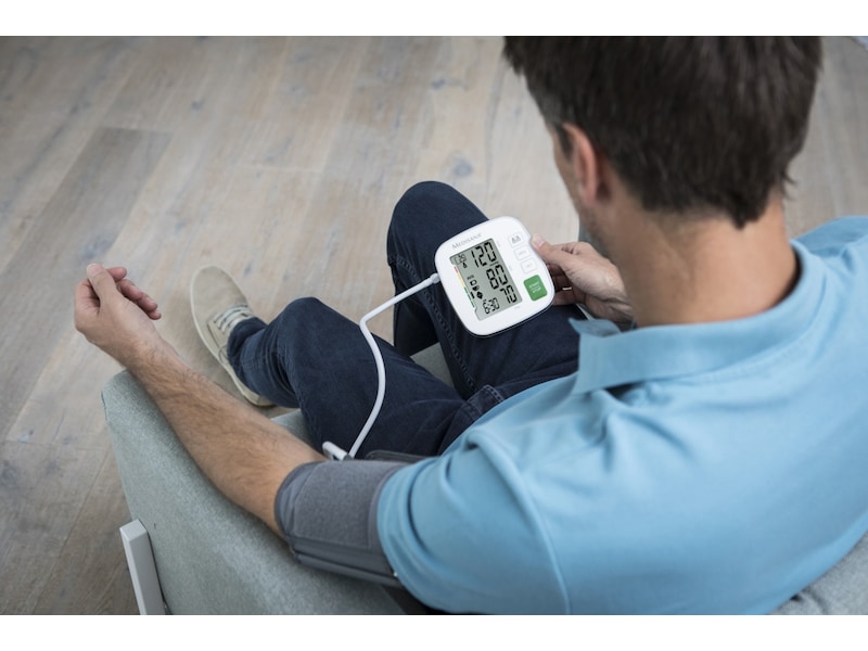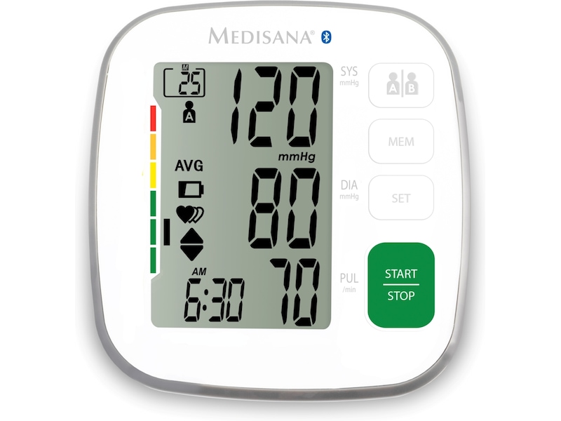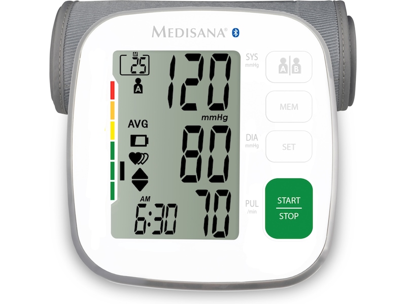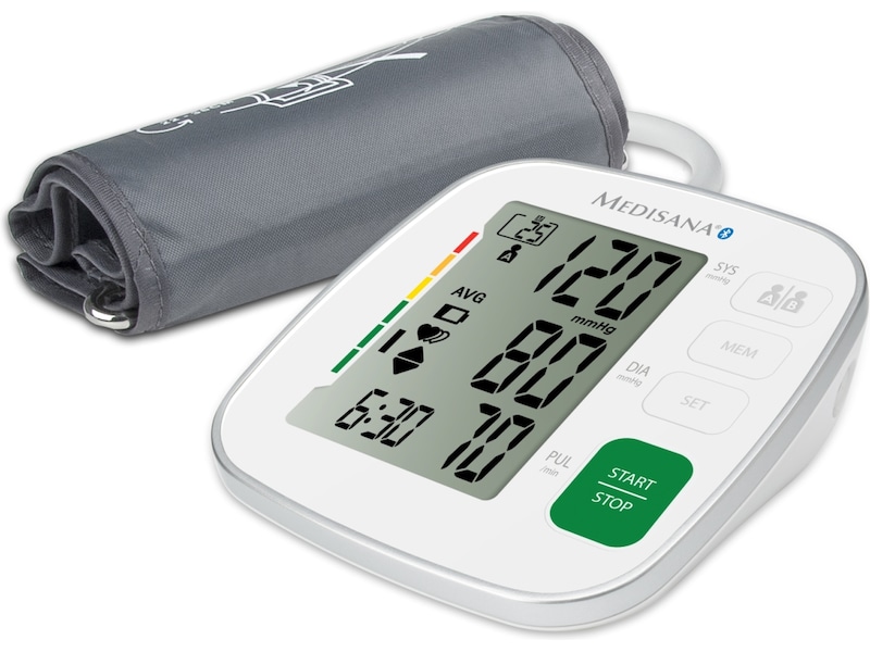 Medisana BU540 connect Overarms blodtrykksmåler, kan kobles til VitaDock+ App 250 minneplasser for hver av to brukere Nøyaktig blodtrykksmåling på overarmen Arytmi påvisning Bluetooth® Smart dataoverføring til VitaDock + -appen for iOS og Android og til VitaDock® Online Beregner gjennomsnittsverdien for dataene fra de tre siste resultatene Vis elementer: systolisk, diastolisk, puls, dato, klokkeslett Ekstra stort, lettlest display Inkluderer batterier Inkludert oppbevaringspose Målingene klassifiseres i henhold til WHOs evalueringssystem ved hjelp av en fargeskala for trafikklys Veldig stor mansjett (armomkretser 22 - 42 cm)