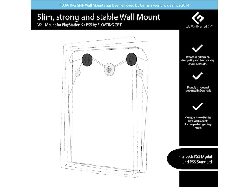 Inkluderer:1x FLOATING GRIP®-veggfeste til PS5 (Passer til både digital og standard versjon)