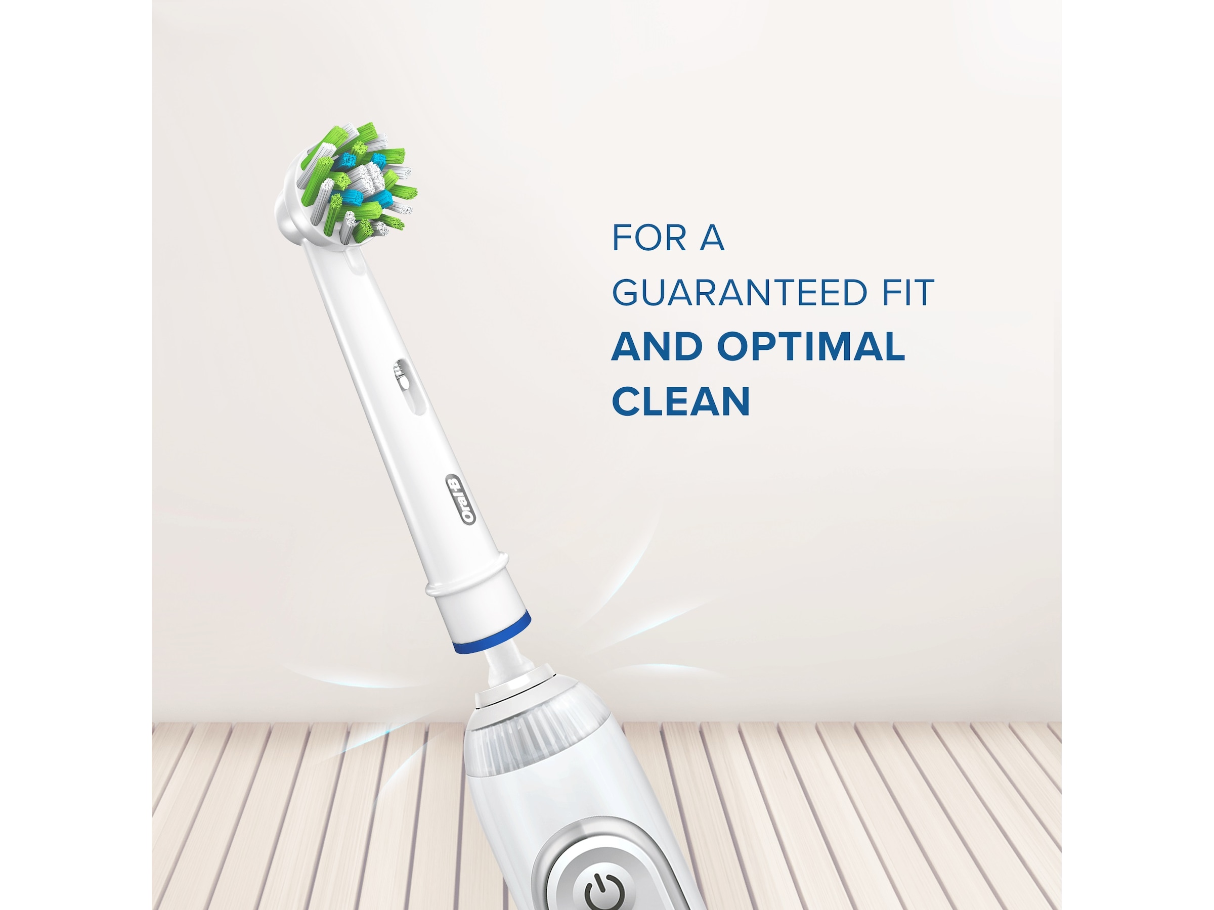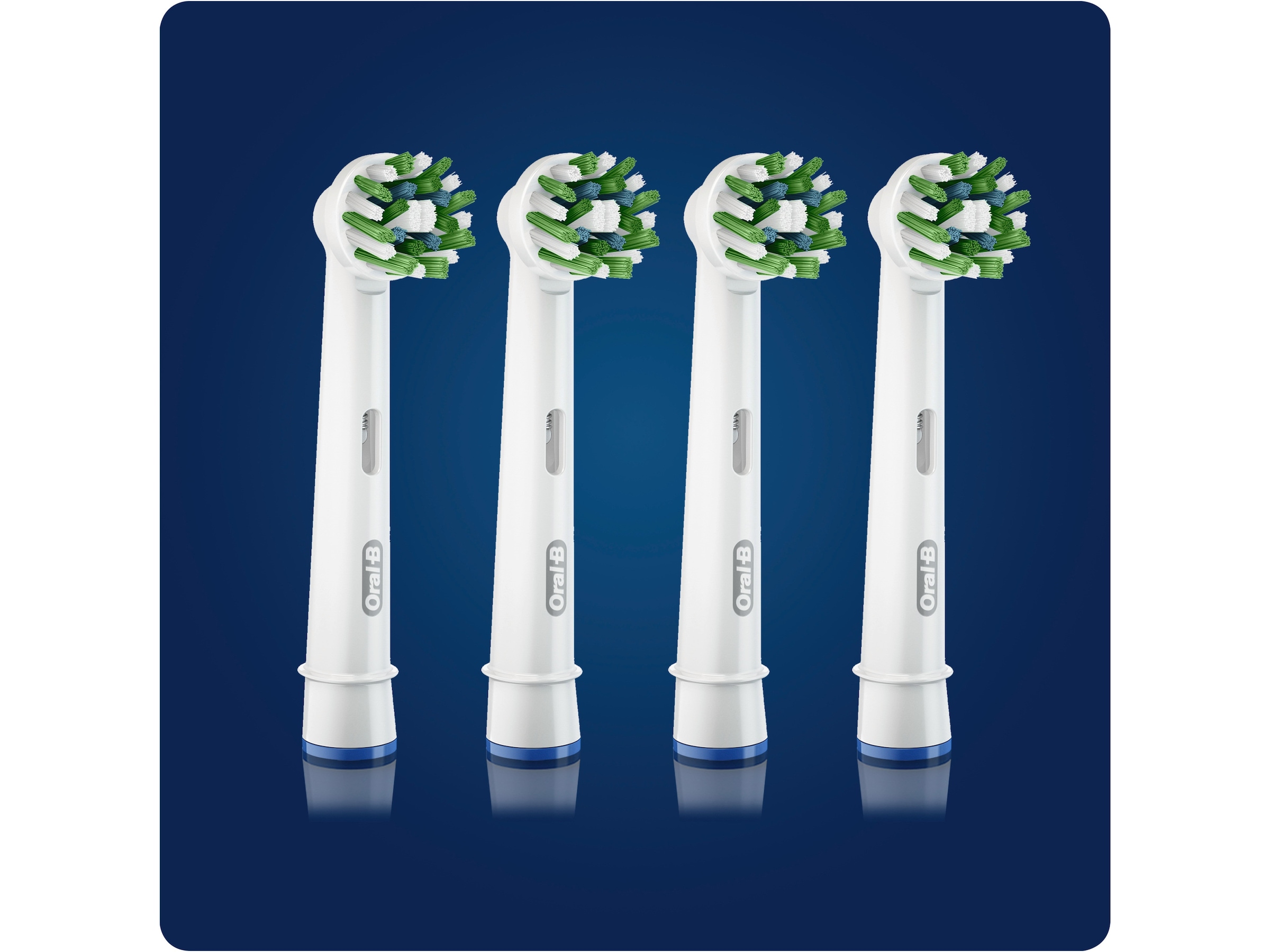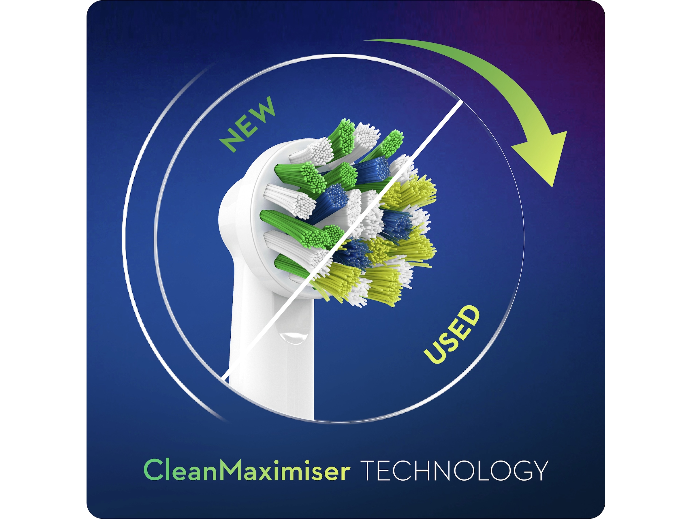 Oral-Bs forbedrede CrossAction-børstehoder er utviklet med CleanMaximiser-teknologi som endrer fargen på børstestråene fra grønn til gul når de bør skiftes, for optimal ytelse og den beste rengjøringen.
