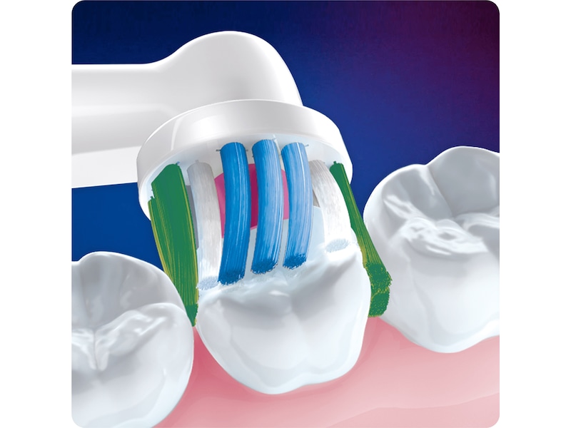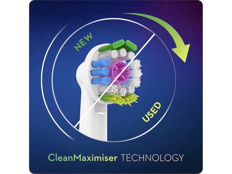 Oral-Bs forbedrede 3D White-børstehoder er utviklet med CleanMaximiser-teknologi som endrer fargen på børstestråene fra grønn til gul når de bør skiftes, for optimal ytelse og den beste rengjøringen.
