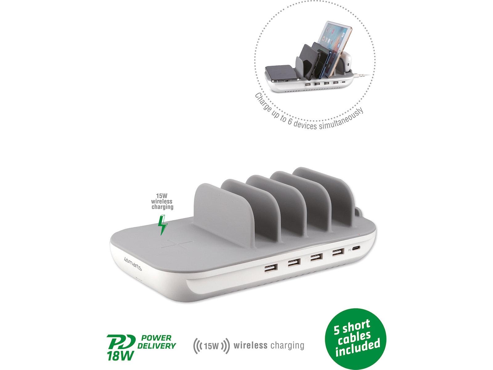 • Stilig ladestasjon for opptil 6 enheter