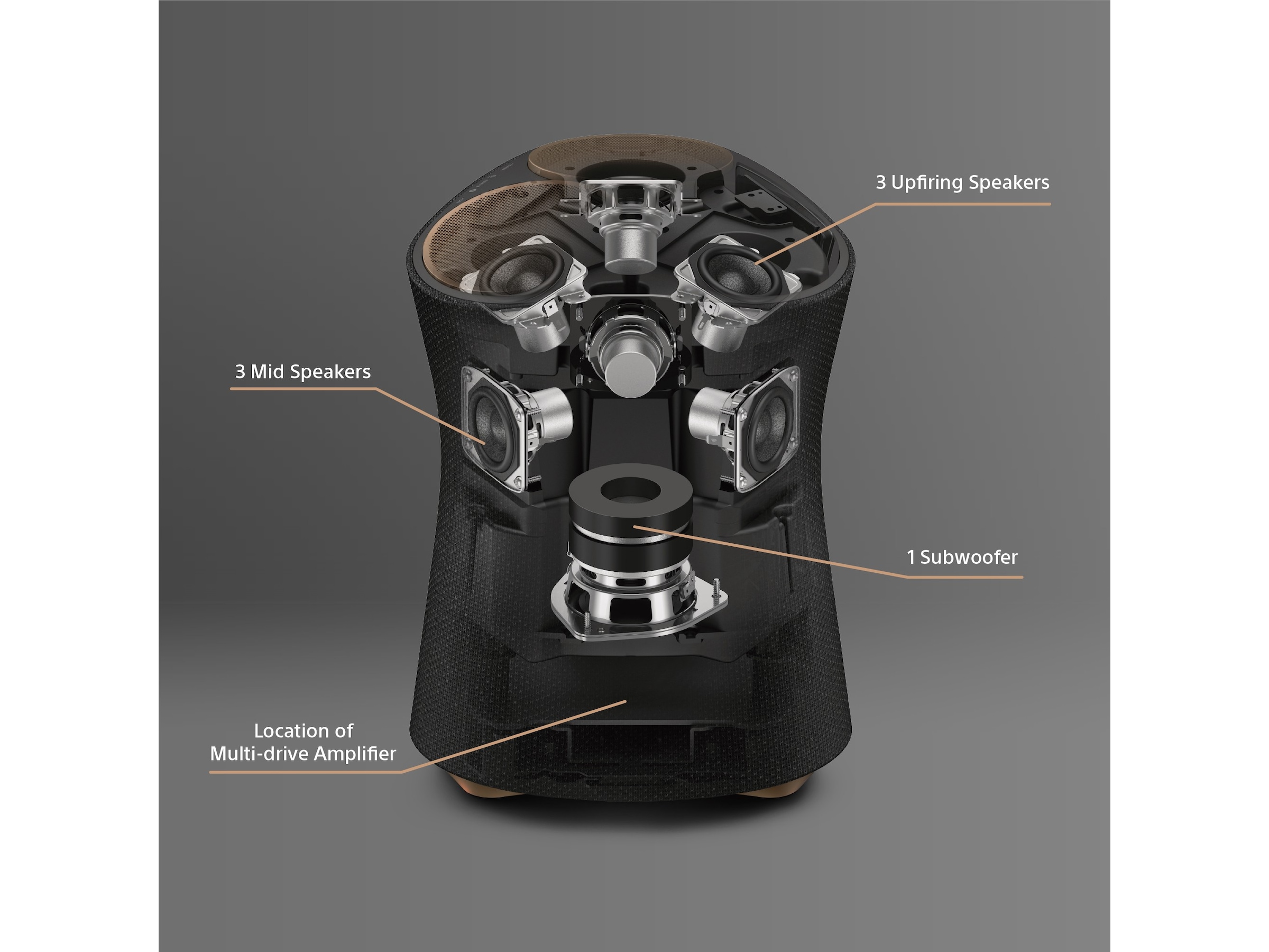 Høyttaler: 1 x basshøyttaler-driver, Høyttaler: 3 x driver for hele området