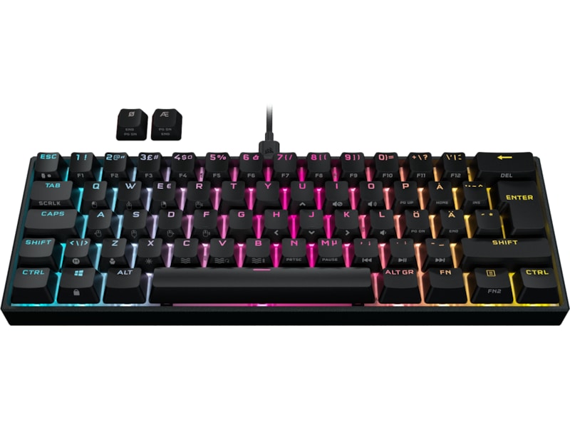 CORSAIR K65 RGB MINI 60% Mechanical Gaming Keyboard kombinerer ytelse på toppnivå med bærbarhet. Tastehetter i dobbeltstøpt PBT sikrer eksepsjonell holdbarhet med et førsteklasses utseende og preg. Med 8000 Hz hyperpolling muliggjort av AXON hyperprosesseringsteknologi, mekaniske CHERRY MX RGB Red-taster, og omfattende innebygde snarveier, tilbyr K65 RGB MINI stor ytelse og funksjonalitet i en kompakt design. Levende RGB-bakgrunnsbelysning som kan tilpasses fullt ut per tast via CORSAIR iCUE-programvaren, i tillegg til endringer av tastetilordninger, egendefinerte makroer og immersiv integrasjon med utvalgte spill. Lagre opptil 50 profiler som du kan ta med deg hvor som helst med 8 MB innebygd lagring. Full N-key rollover, Windows Key Lock-modus og en avtagbar flettet USB Type-C-kabel gjør K65 RGB MINI til en høytytende spillkamerat hjemme og på farten, slik at du kan vinne uansett hvor du er.