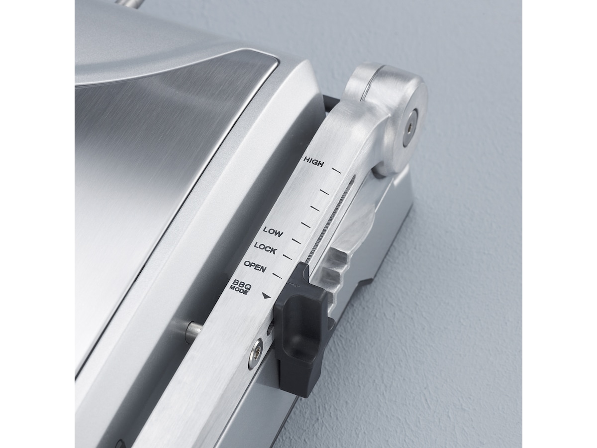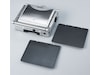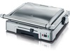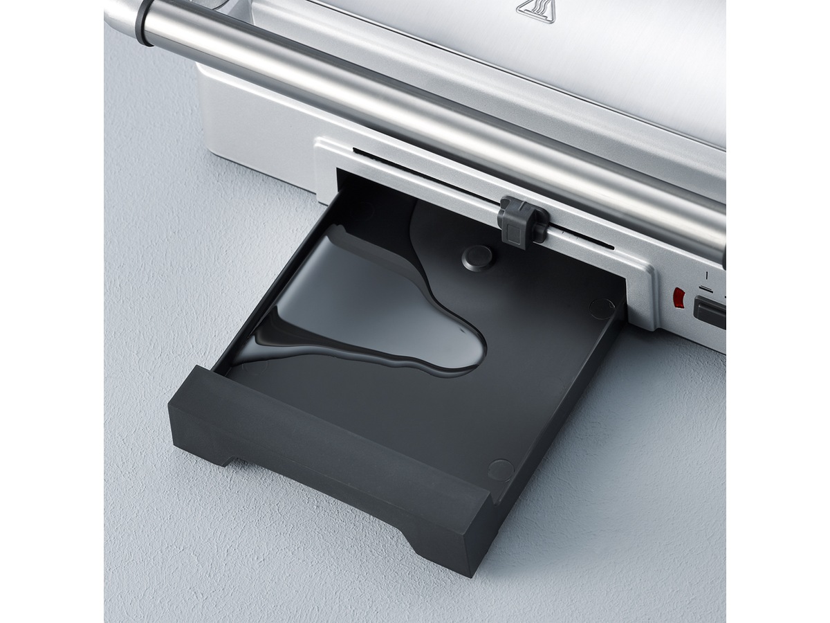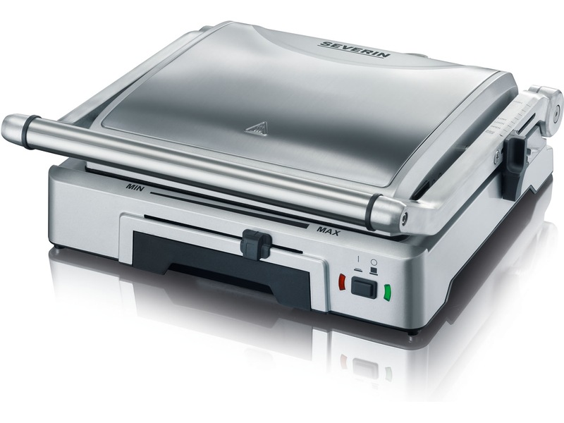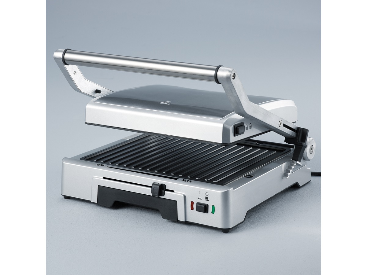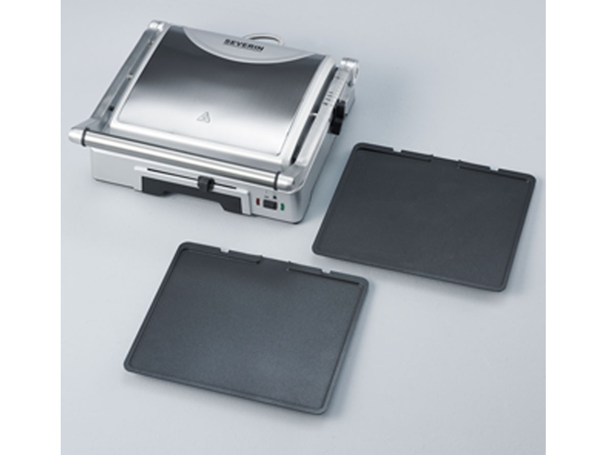 Automatisk grill, børstet rustfritt stål Effekt: ca. 1800 W. egnet for tilberedning av kjøtt, fjærfe, snacks, panini varmebestandig maling mål på grillplaten: 27 x 24 cm 2 sett avtakbare, non-stick belagte plater: rillede grillplater og flate stekeplater avtakbare grillplater som er enkle å rengjøre flytende hengsel med stoppanordning for ”gratinering” matlaging grillfunksjon: grillen kan åpnes for stor grillflate På / av bryter temperatur kontroll pilotlys fettoppsamlingsbrett