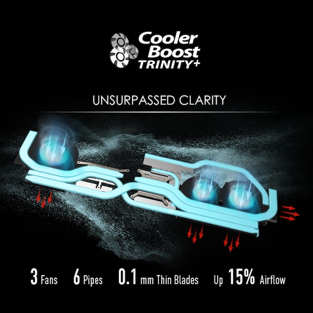 MSIs eksklusive Cooler Boost-teknologi sikrer optimal varmespredning. Med verdens tynneste skarpkantede viftebladdesign på 0,1 mm forbedrer den nye Cooler Boost Trinity+ viftens luftstrøm og gir deg den beste spillopplevelsen.
