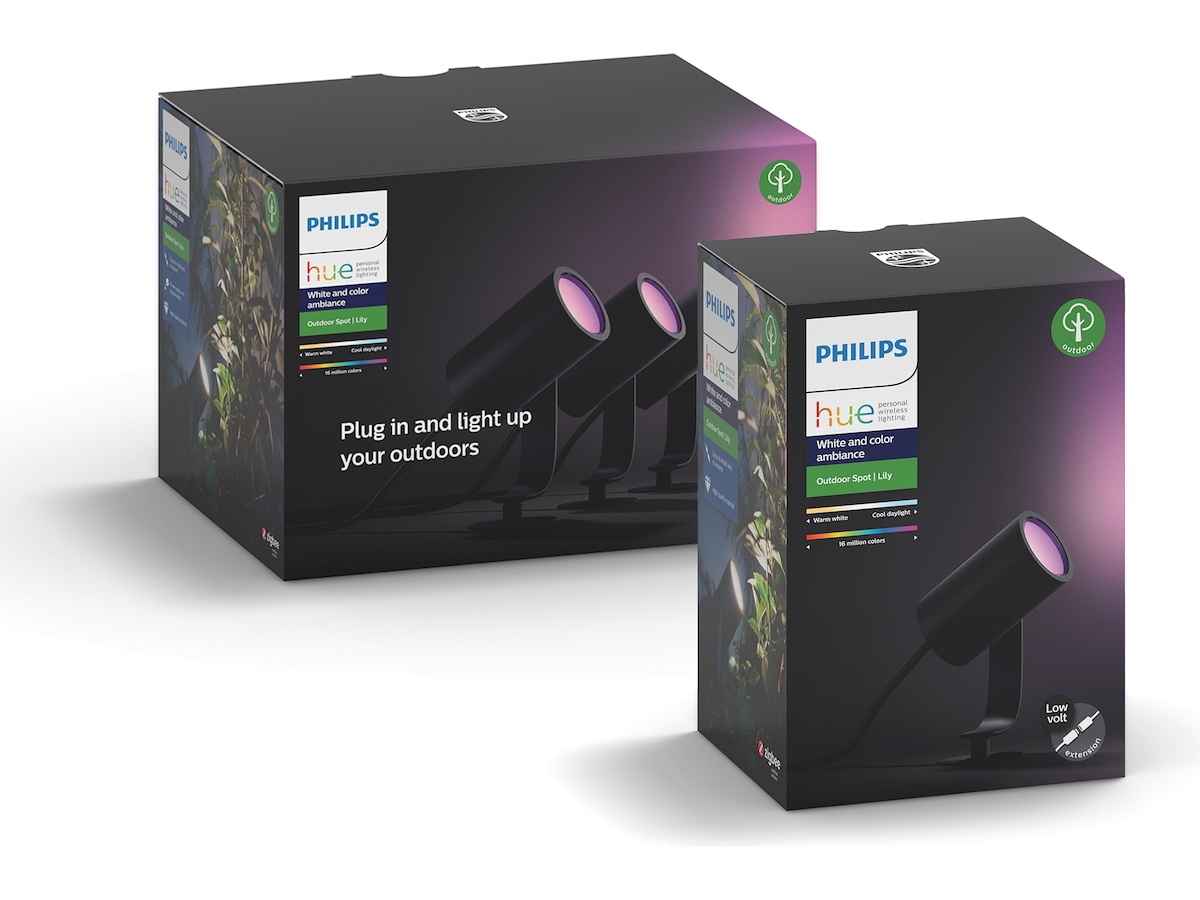 Lily er den første utendørs spotlighten med full Philips Hue Color-funksjon, med tilgang til over 16 millioner fargenyanser og flere forhåndsinnstilte temaer. Koble utendørsbelysningen din med resten av Hue-økosystemet, med geofencing-funksjon for å kontrollere når lysene slås på. Bruk Lily som en «lyskaster» for å lyse opp husvegger eller dekorasjoner i hagen din. Dette utvidelsessettet leveres uten strømadapter, perfekt hvis du skal plassere flere Lily-lamper nær hverandre. Hvis du derimot skal spre dem ut over en stor hage, anbefales likevel grunnsettet.