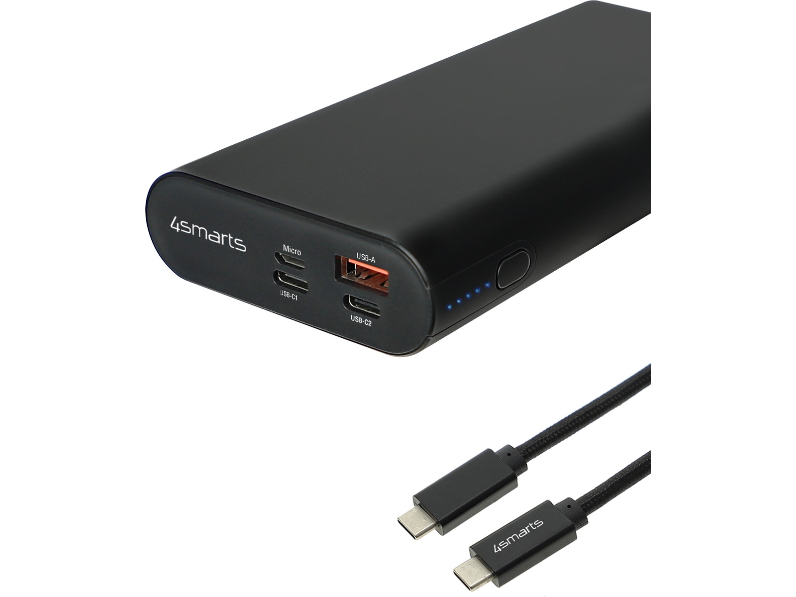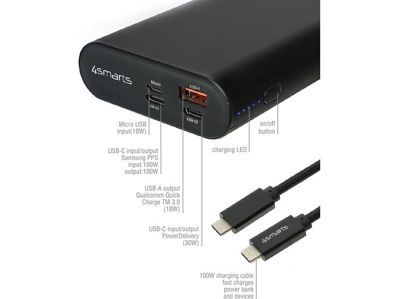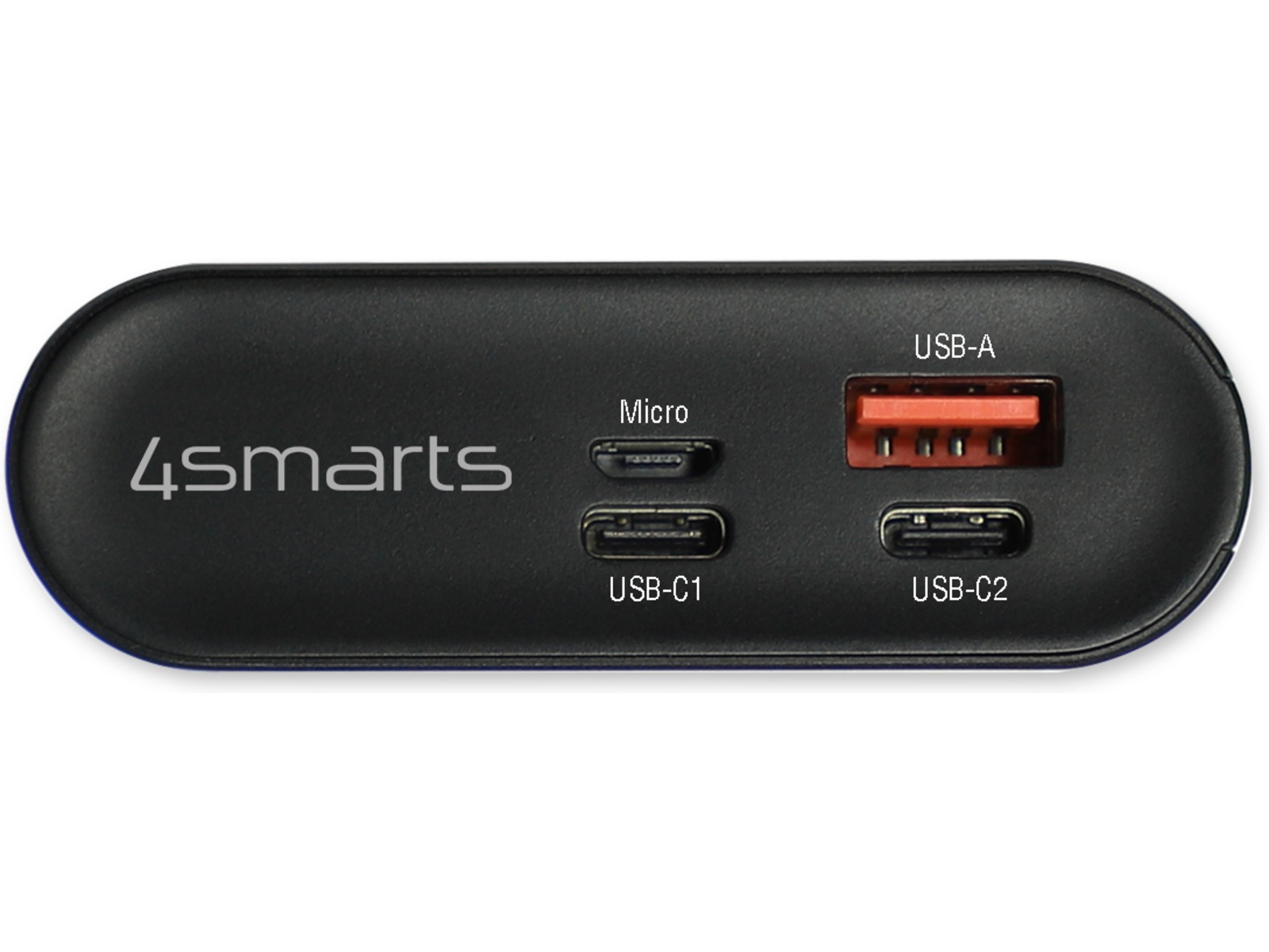 Ha strøm i flere dager – Høytytende reservebatteri med 4 porter for ekstern strømforsyning til smarttelefoner, nettbrett og andre mobilenheter. De innovative grafencellene sørger for lang levetid og muliggjør ekstremt rask opplading av nødladeren.