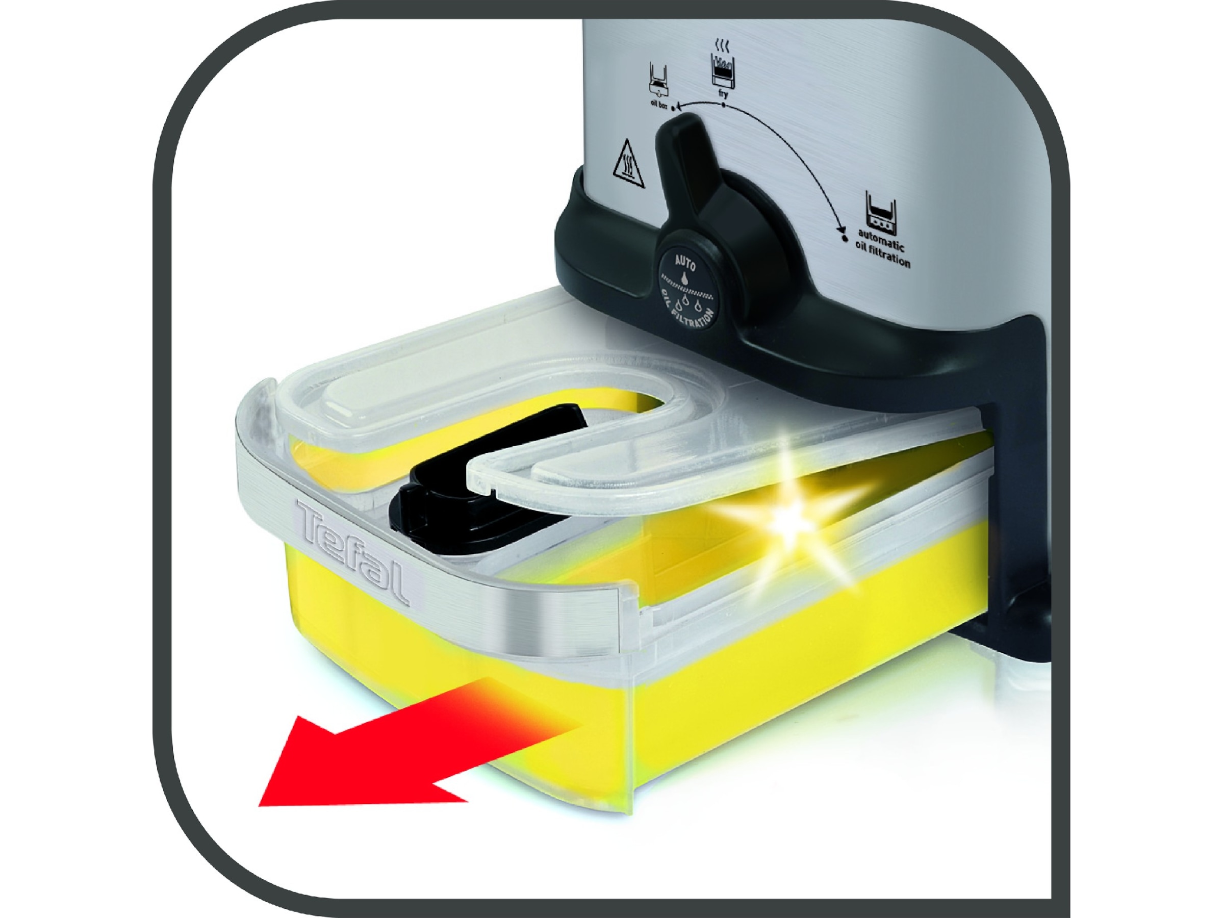 Når friteringen er ferdig, slår du av apparatet og vrir knotten til automatisk filtrering”. Når oljen begynner å nedkjøles, føres den gjennom et filter og tømmes i oljebeholderen under. Dermed vil oljen alltid være ren og kan brukes om igjen mange ganger.
