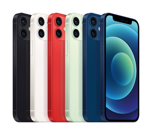 ⁵iPhone 12 mini ble testet under kontrollerte laboratorieforhold og har, i henhold til IEC-standard 60529, en sprut-, vann- og støvbestandighetsrangering på IP68 (maksimal dybde på 6 meter i opptil 30 minutter). Sprut-, vann- og støvbestandighet er ikke permanente tilstander. Bestandigheten kan svekkes som følge av normal slitasje. Ikke lad en våt iPhone. I brukerhåndboken er det beskrevet hvordan du rengjør og tørker den. Garantien dekker ikke skader forårsaket av væske.