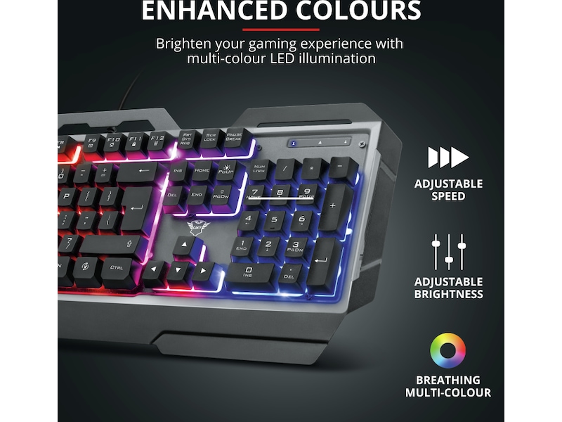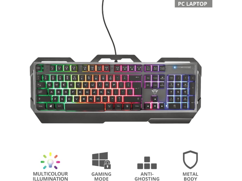 Trust GXT 856 Torac gamingtastatur i metall er utviklet for seriøs gaming og kombinerer holdbarhet med brukervennlighet, med et ekstra fargeshow fra en fantastisk LED-belysning.