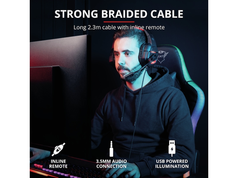 GXT 448 Nixxo er ekstremt enkel å bruke. Bare koble til 3,5 mm AUX-kabelen til laptopen din, så er du klar til å sette i gang. Ved å koble til USB-kabelen slås LED-lampene på, og hvis du trenger å koble headsetet til en PC som bruker to separate lydtilkoblinger, har Nixxo også en Y-splitter. Juster volumet og demp/slå på mikrofonen via den integrerte kontrolleren, så har du full kontroll over lydopplevelsen din.