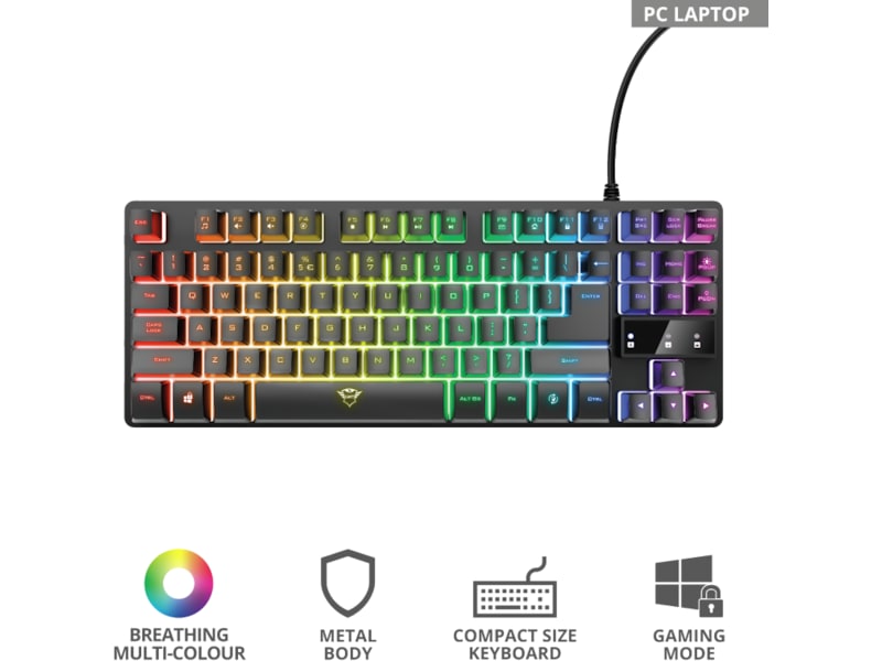 Funksjonalitet er en ting, men ikke glem stilen! Takket være LED-belysningen til Trust Thado TKL vil du være sikker på å stille konkurrentene dine i skyggen i alle situasjoner. Så ta en god titt på pusteeffekten, fokuser på oppgaven og begynn å vinne battle royale-kampene.