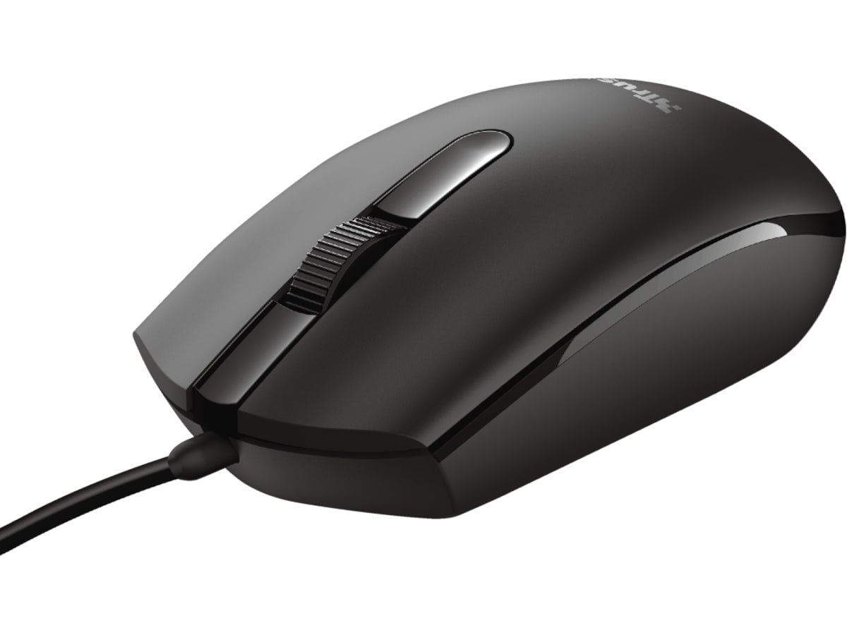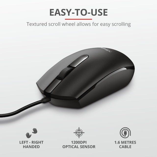 - Kablet mus med 3 knapper; ikke noe behov for konfigurasjon