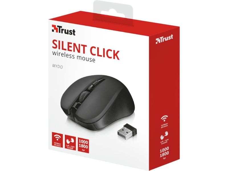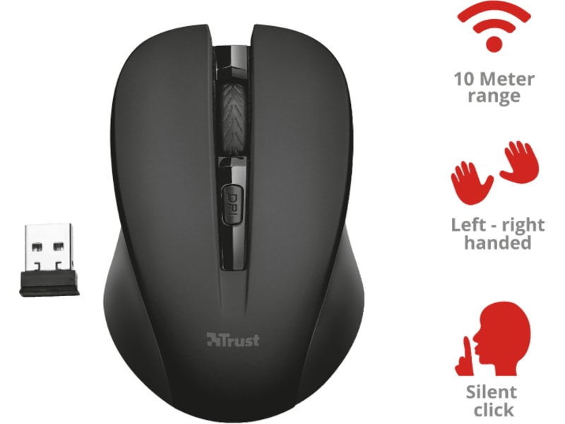 Viktigste egenskaper Reduserer klikkelyder med minst 90 % 10 m trådløs rekkevidde (2,4 GHz) Knapp for hastighetsvalg (1000/1400/1800 dpi) Micro-USB-mottaker som er lett å oppbevare På/av-bryter Kan brukes av både venstre- og høyrehendte