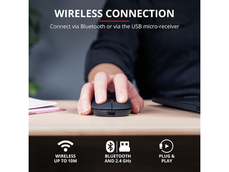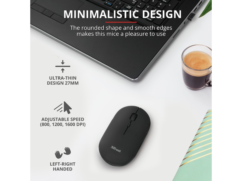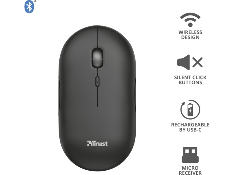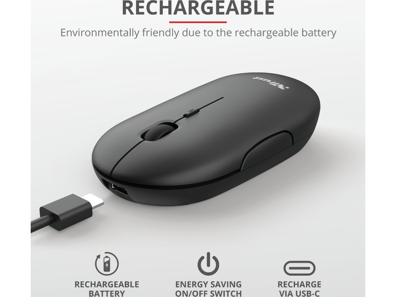 Trust Puck er designet for å være den foretrukne løsningen for dine utfordringer når du er på farten. Denne ekstra tynne, trådløse musen er liten nok til å ta med seg, samtidig som den er komfortabel nok til å bruke. Den er fullpakket med praktiske funksjoner, slik som dobbel trådløs tilkobling, lydløse knapper og et oppladbart batteri. Og den fungerer også for både venstre- og høyrehendte brukere!