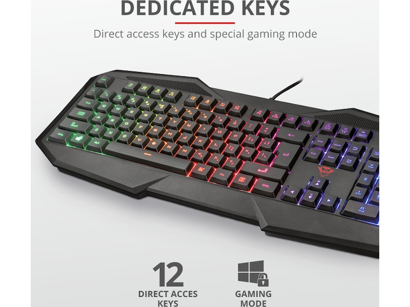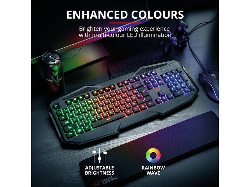 Trust GXT 830-RW Avonn tilbyr deg et gamingstastatur i full størrelse med 12 multimedietaster. La den overbevisende Rainbow Wave-belysningen veilede deg slik at du alltid trykker på riktig tast! Gamingtastaturet Avonn vil fullføre spilloppsettet ditt med livlige farger. LED-lysene kan justeres i lysstyrke, noe som også gjør GXT 830-RW perfekt for spill når det er mørkere: Velg dine kampfarger eller trekk fiendene dine inn i nettet ditt med den forlokkende Rainbow Wave-belysningen.