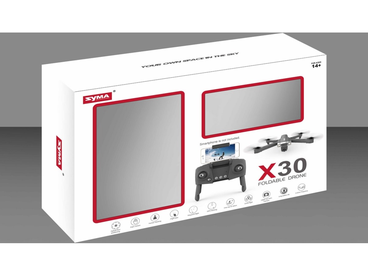 Syma X30 har et oppladbart batteri på 1700 mAh. Batteriet gir dronen en total flytid på opptil 26 minutter og lades med den medfølgende USB-ladekabelen. Det tar ca. 3 timer å lade batteriet helt opp. Dronen er sammenleggbar, lett (kun 210 gram) og smidig å ta med seg.