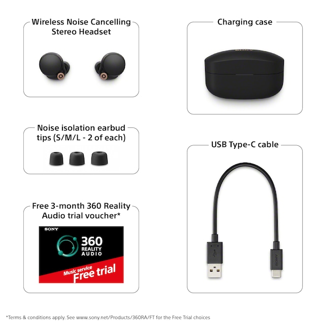 Når du åpner emballasjen til WF-1000XM4-hodetelefonene, finner du støyisolerende ørepropptupper i tre størrelser og en USB-C-ladekabel.