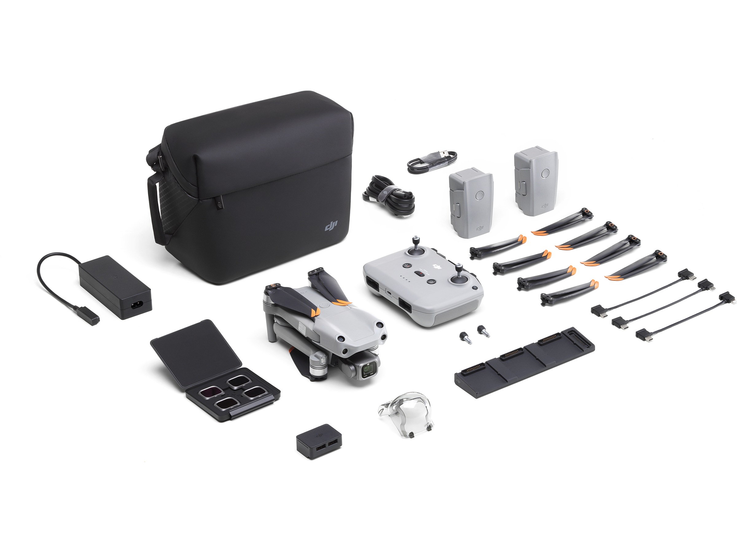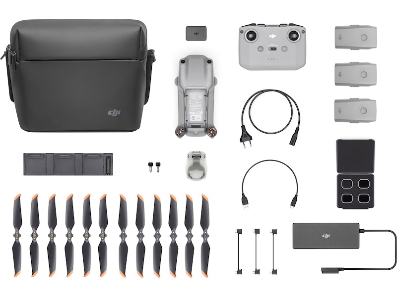 6 par lavstøyspropeller, Skulderbag, ND-filtersett (8/16/32), Slingrebøylevern, Et par ekstra kontrollpinner, 3 intelligente flybatteri, Adapter fra batteri til nødlader, RC-kabel (USB-C-kontakt), RC-N1-fjernstyring, RC-kabel (mikro-USB-kontakt), RC-kabel (Lightning-kontakt), USB-C-kabel, Batterilader, Batteriladehub