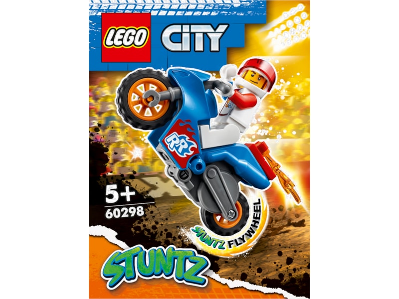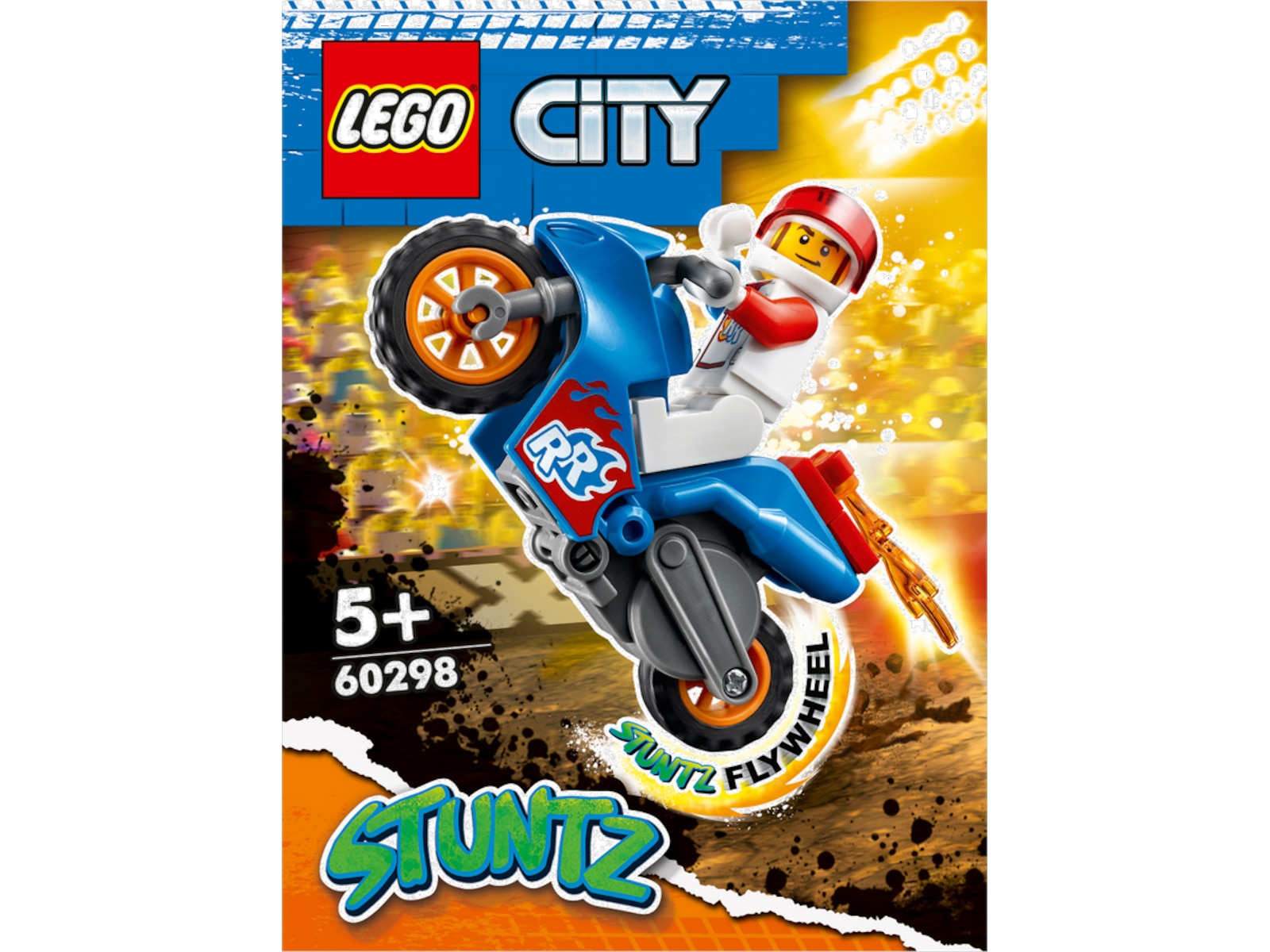 - Gi barnas fantasi vinger med settet LEGO® City Stuntmotorsykkel som hopper (60298), som inneholder en svinghjuldrevet motorsykkel og den dristige stuntkjøreren Rocket Racer fra LEGO City TV-serien.