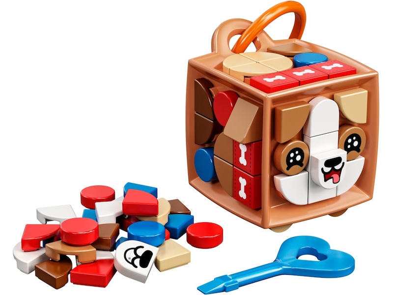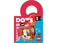Gi barn det søte hundesettet LEGO DOTS Hundemerke til bag, hvor de skal bygge en robust kube med silikonring, nøkkelformet flisfjerner samt mange fargerike fliser.