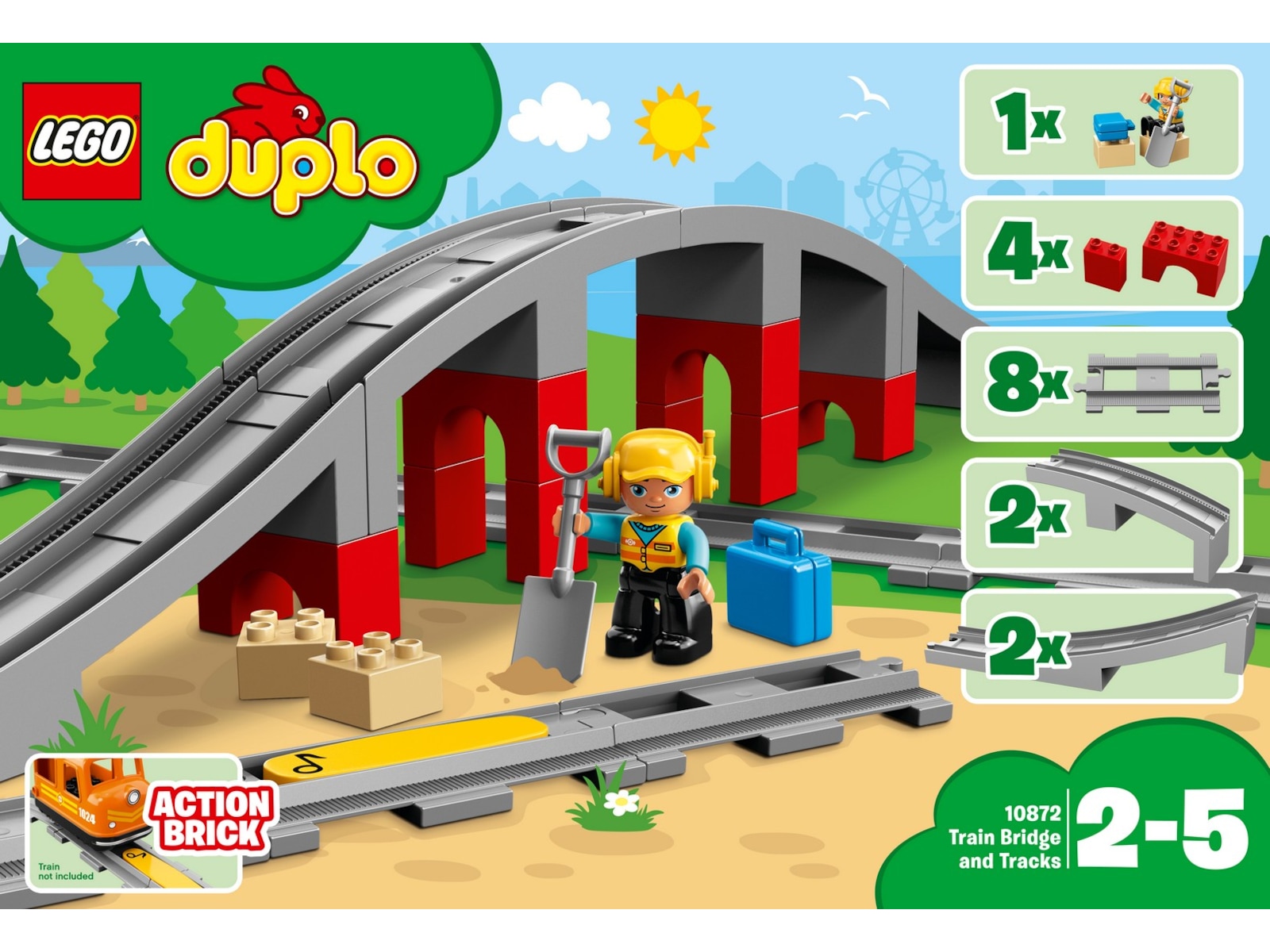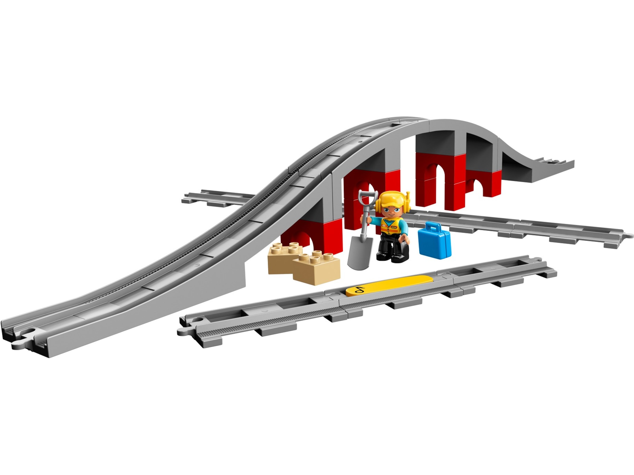 Følg med mens smårollingen din bygger broen og setter sammen togskinnene etter eget hode. Hjelp førskolebarnet ditt med å sette på plass den gule funksjonsklossen på skinnen for å få kompatible DUPLO tog til å tute når de kjører over den. Inneholder også en LEGO DUPLO figur av en bygningsarbeider, to løse klosser, en spade og en koffert for gøyalt rollespill og historiefortelling.