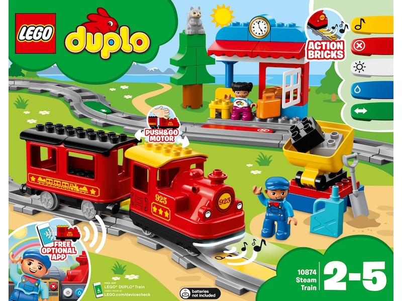 Med skyv og slipp-motoren kan de leke togfører: Når barnet skyver toget lett forover eller bakover, tøffer toget av gårde, og når barnet holder toget fast eller løfter det av skinnegangen, stopper toget. Hjelp barnet med å plassere de fem fargede funksjonsklossene forskjellige steder langs skinnegangen for å få toget til å tute, slå på og av lysene, stoppe for å fylle drivstoff, endre kjøreretning og stoppe helt. Dette LEGO DUPLO settet inneholder togstasjon, en tippvogn for kull, to DUPLO figurer og en dyrefigur samt en enkel skinnegang og byr på klassisk togmoro for førskolebarn. Last ned den valgfrie appen for å låse opp enda flere lekemuligheter, blant annet en fjernkontrollfunksjon og gøyale aktiviteter som du og barnet ditt kan kose dere med!