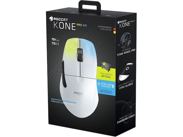 Hils på ROCCAT® Kone Pro Air ergonomisk optisk trådløs gamingmus med RGB-belysning, den første trådløse musen fra Kone noensinne. Kone Pro Air er perfeksjonert på grunnlag av 14 års håndverk, med en vekt på bare 75 g. Den er lett, komfortabel og avansert. Den bruker Titan Switch Optical, AIMO RGB-belysning, vår 19K DPI Owl-Eye-sensor, USB-C PhantomFlex™-ladekabel og varmebehandlede glidere.